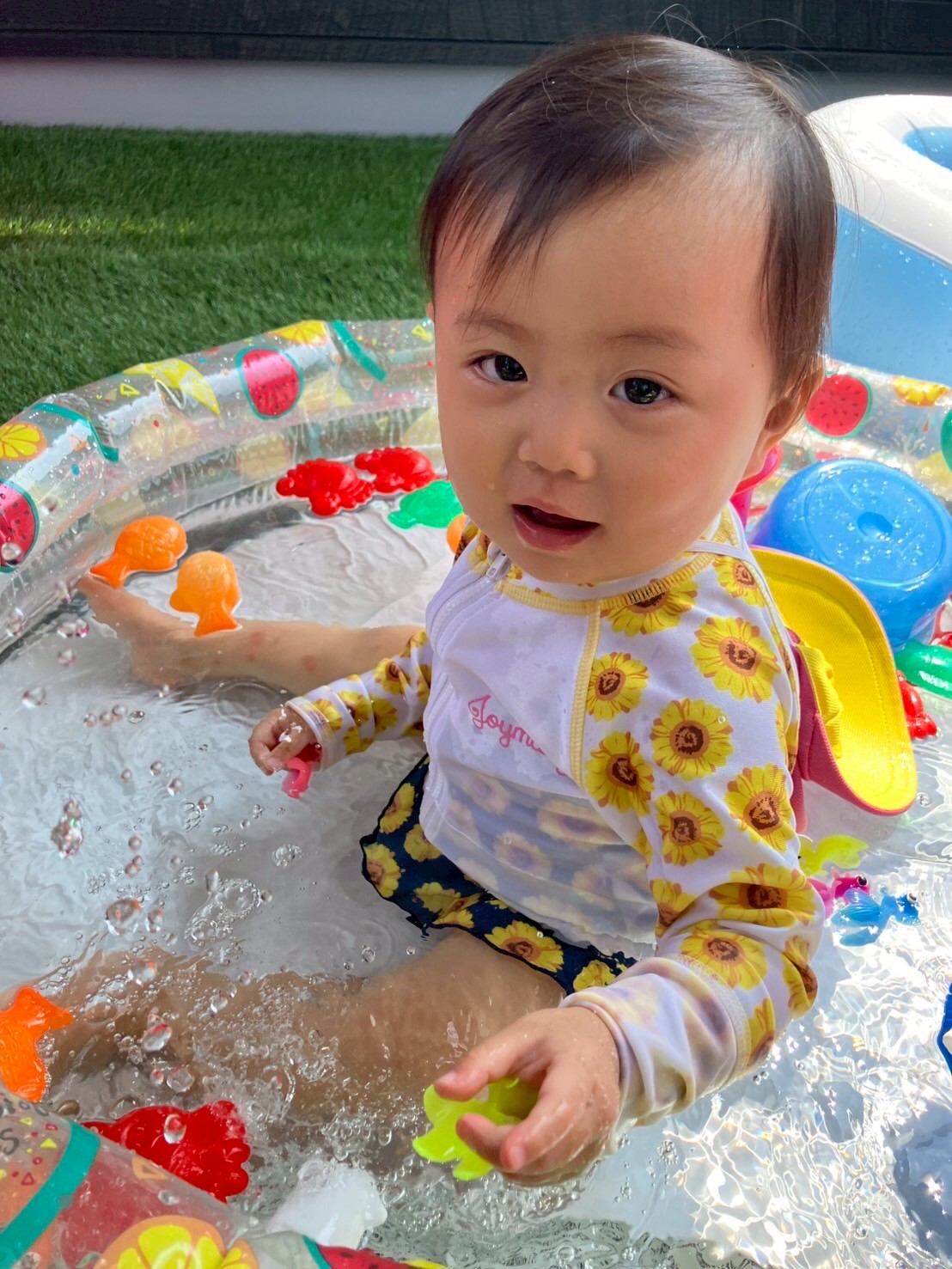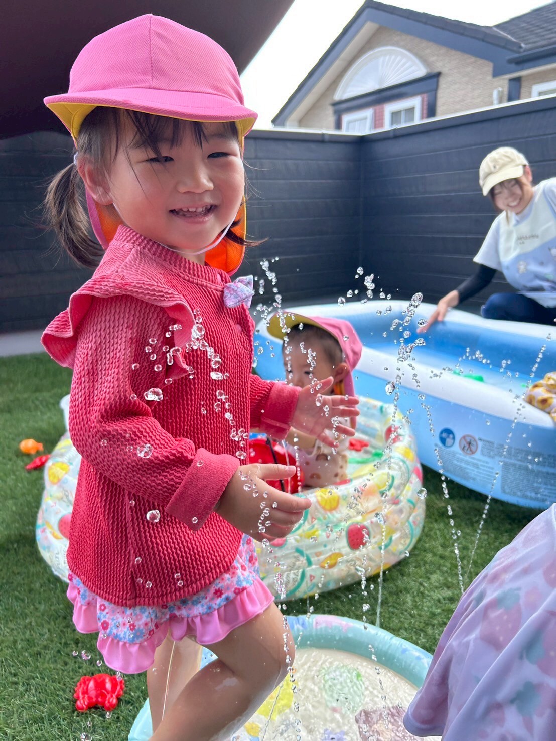 プールの中に入ったり金魚をバケツに入れて集めたりして、気持ちよさそうに遊んでいました😊