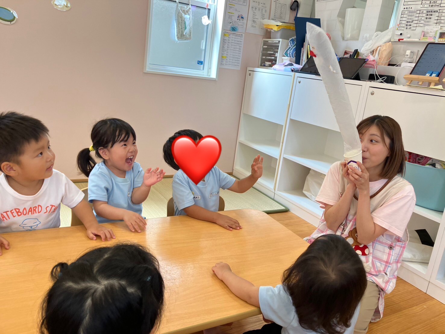 プク〜っと膨らんだり萎んだりするおばけにみんな興味津々でした💓その後はりす、ひよこぐみさんは水遊びをしました🐳