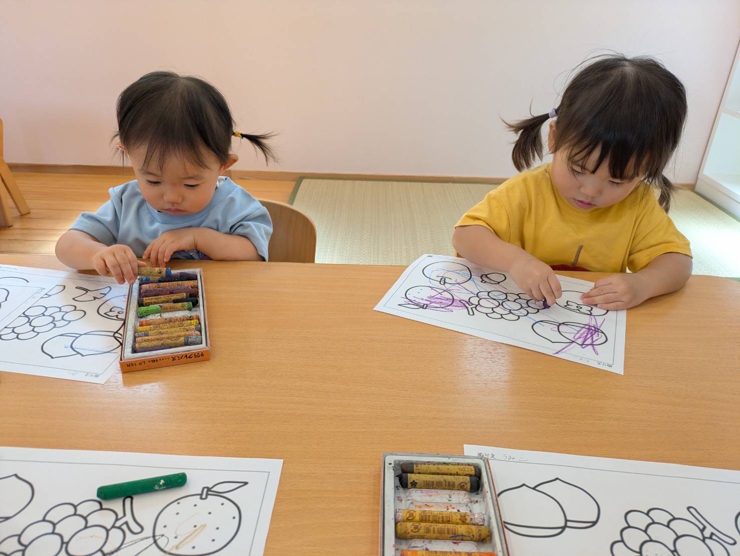 秋の果物を好きな色のクレヨンで楽しそうに塗っていましたよ🍎🍇🍊