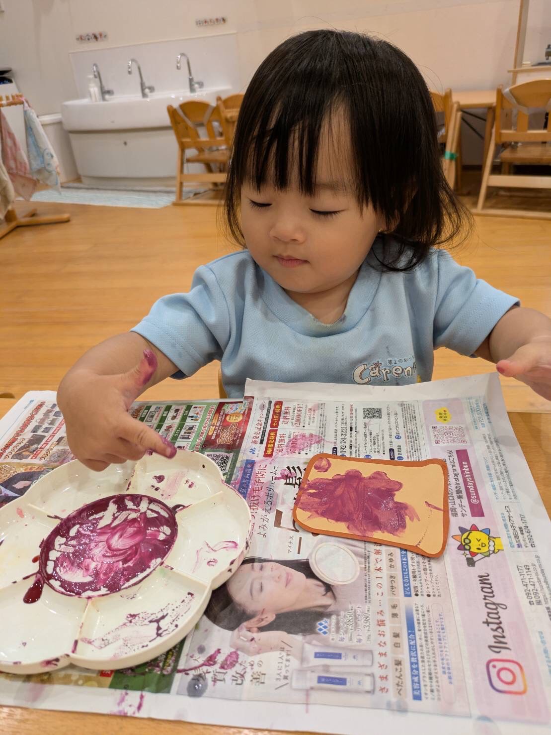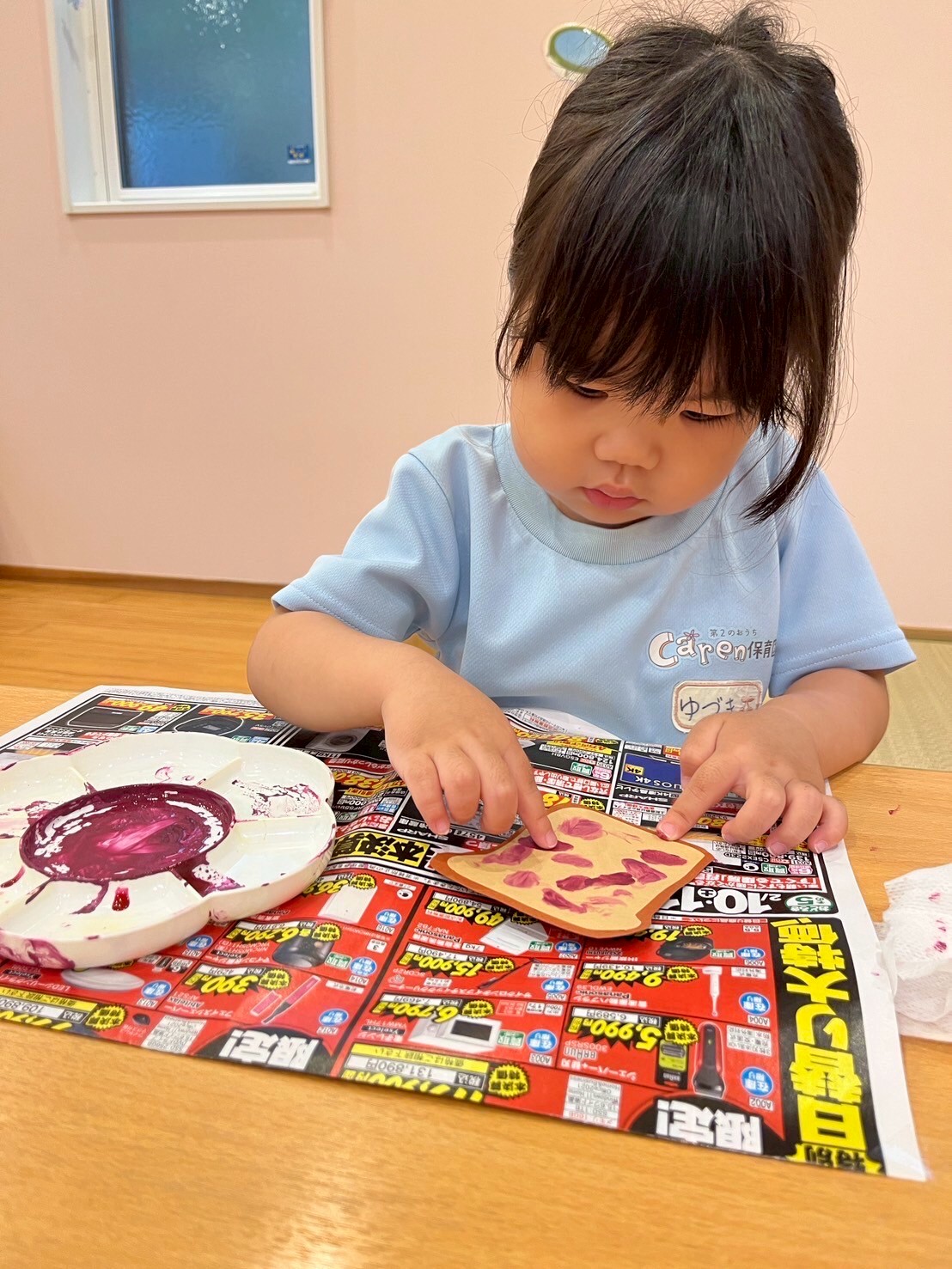 指に絵の具を付けてパンにぬりぬり👆「おいしくなぁれ♡」と可愛い声が聞こえましたよ✨直接絵の具を触ることにドキドキする姿や「もっと触りた〜い♡」と手が絵の具まみれになる程楽しむ姿も🤗🎨