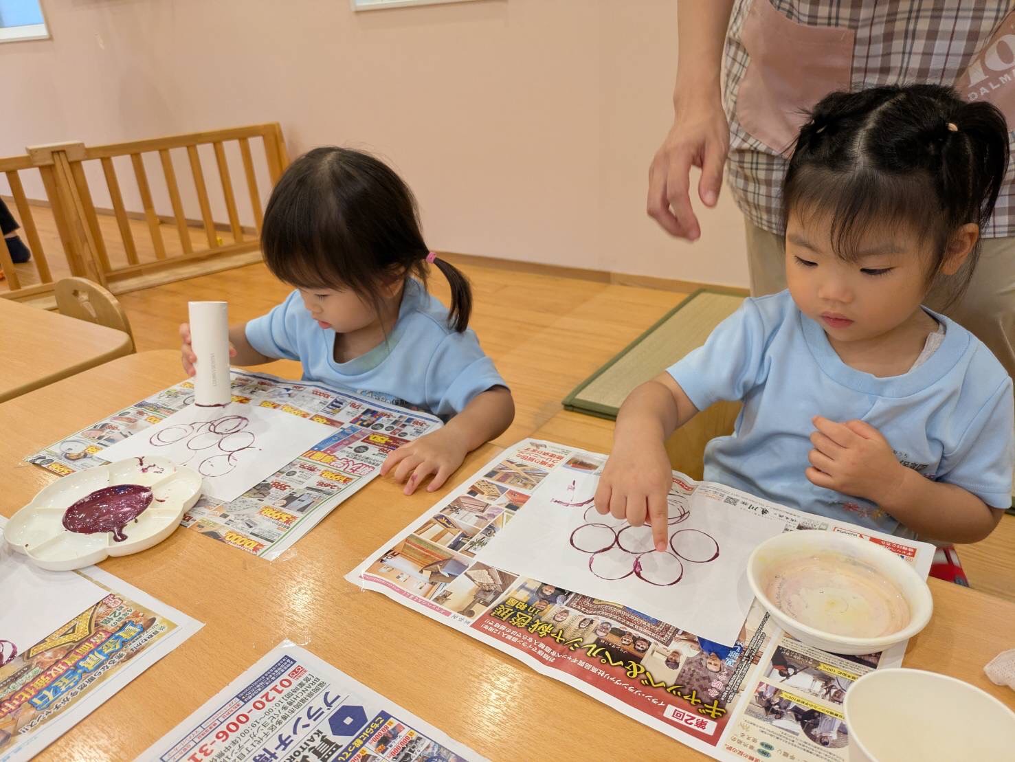 トイレットペーパーの芯で絵の具のスタンプをしたら、指に水を付けて広げます👆🌀