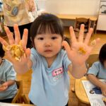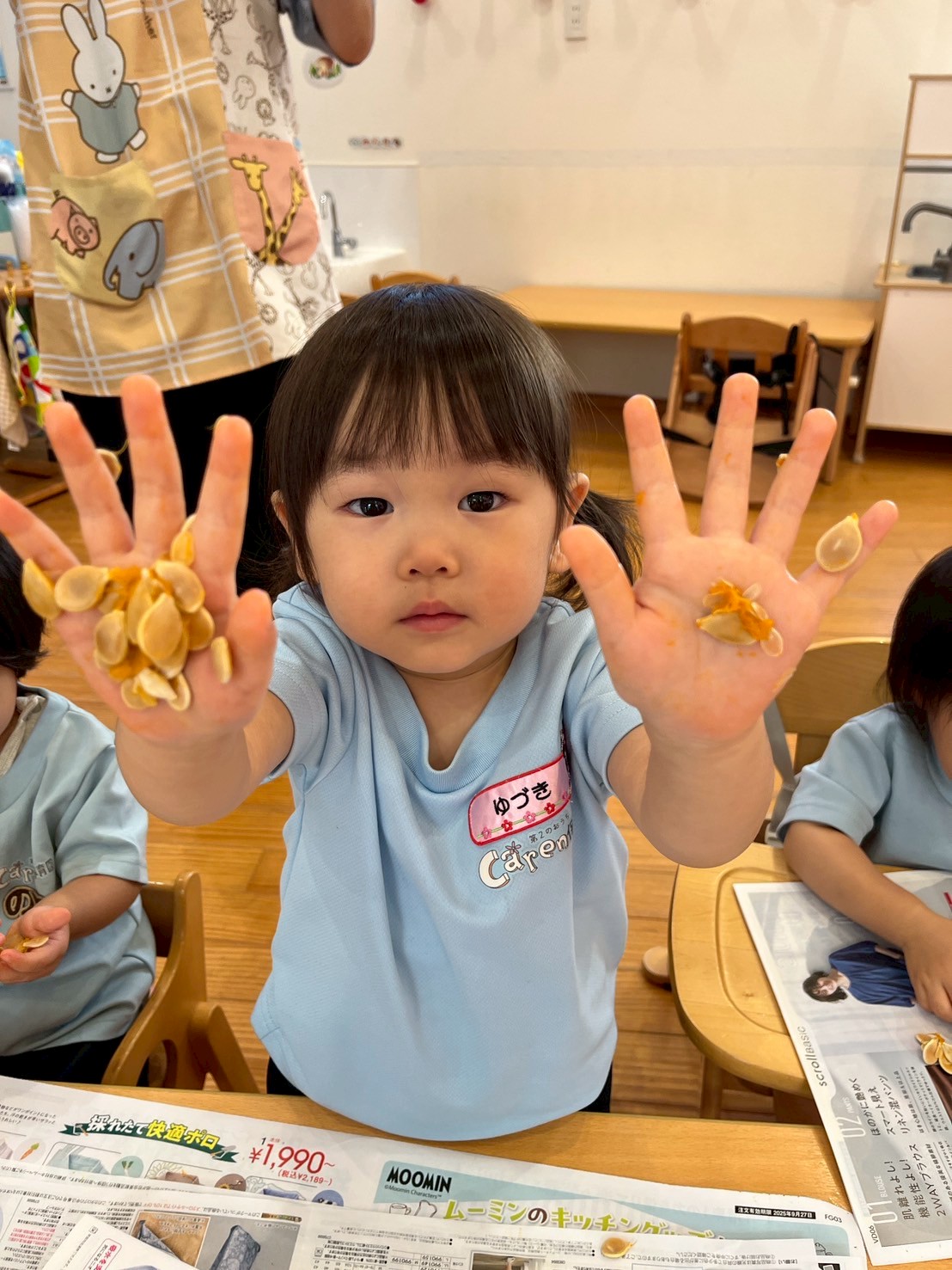 大きなかぼちゃを一人一人のサイズに切り分けて、種取りのお仕事をお願いされたお友だち👦🏻👧🏻✨