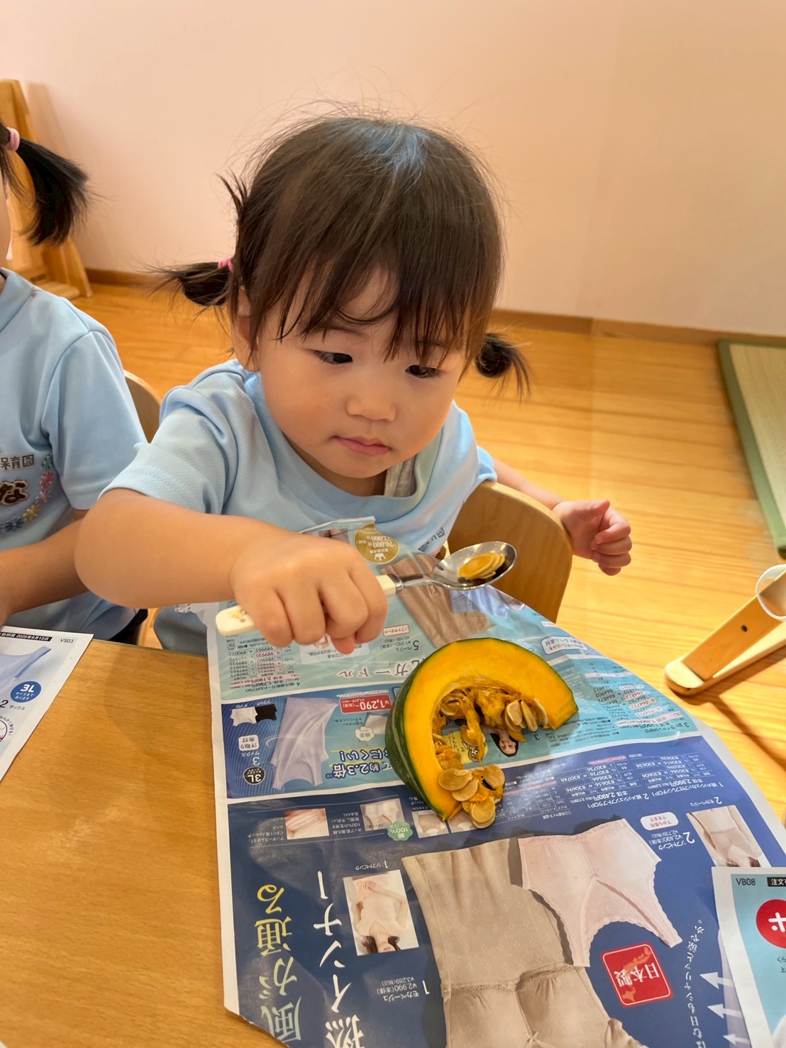 みんなで頑張って準備したかぼちゃは、午後のおやつでドーナツになることを知り、頑張りました🥄💖