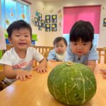 緑色のかぼちゃを触った後は、先生が包丁で切りますよ✨中身は何色かな?