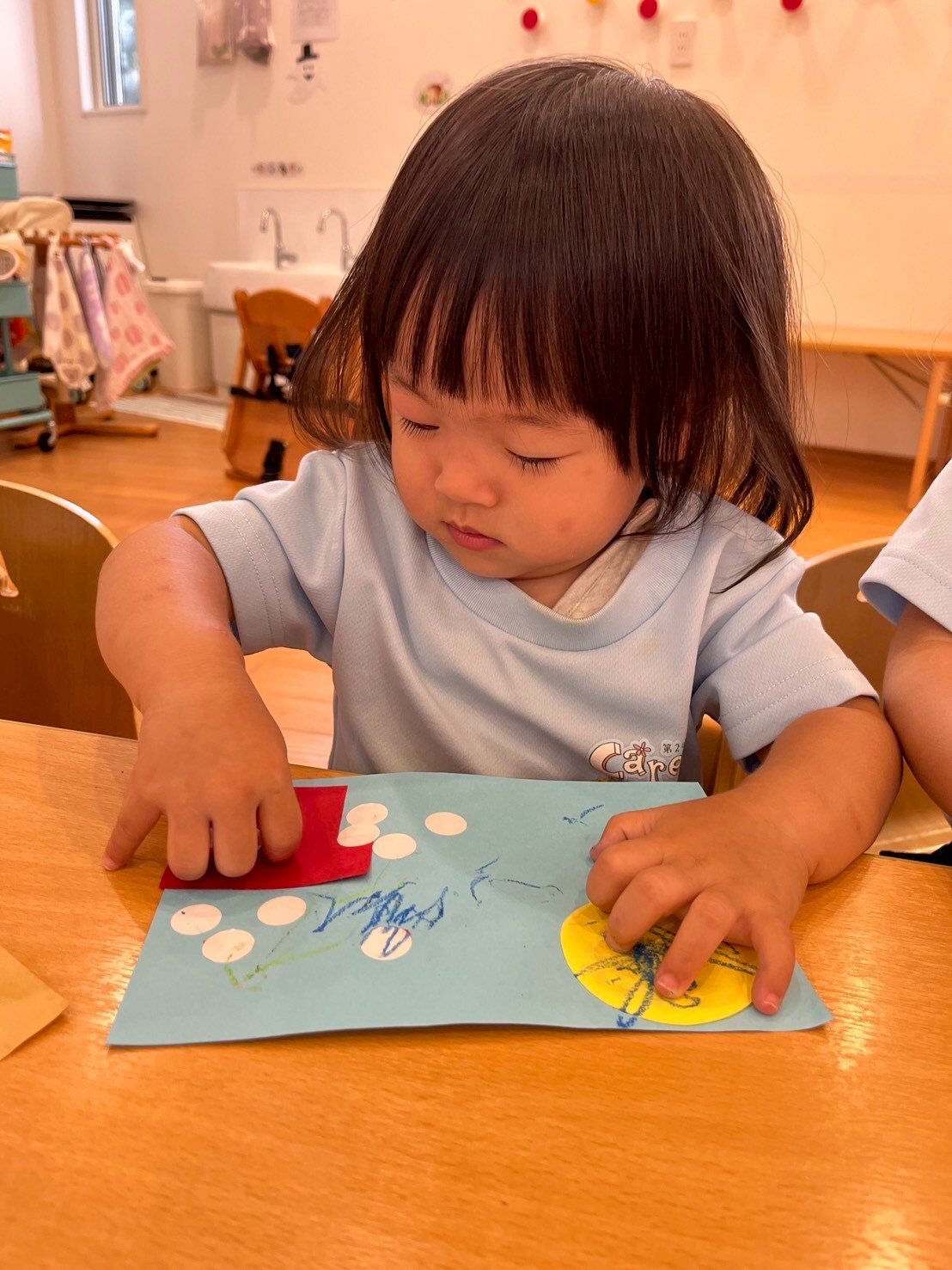 10月6日 2025.10.06 / 未分類 今日はお月見🌙 お月見にちなんで朝の会でお団子を触りました🍡 「べたべた」「くっつくよ」など感触を楽しんだ後はお月見の台紙にシール貼り☝️ ペタペタ貼ってお団子が完成✨ お月様にも模様を描いて素敵なお月見の製作になりまし…続きを読む