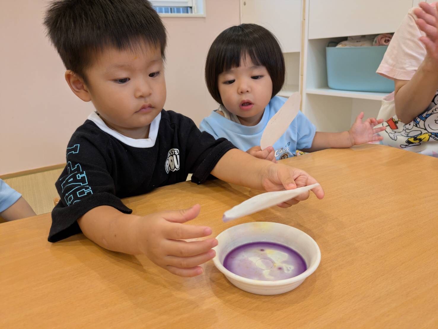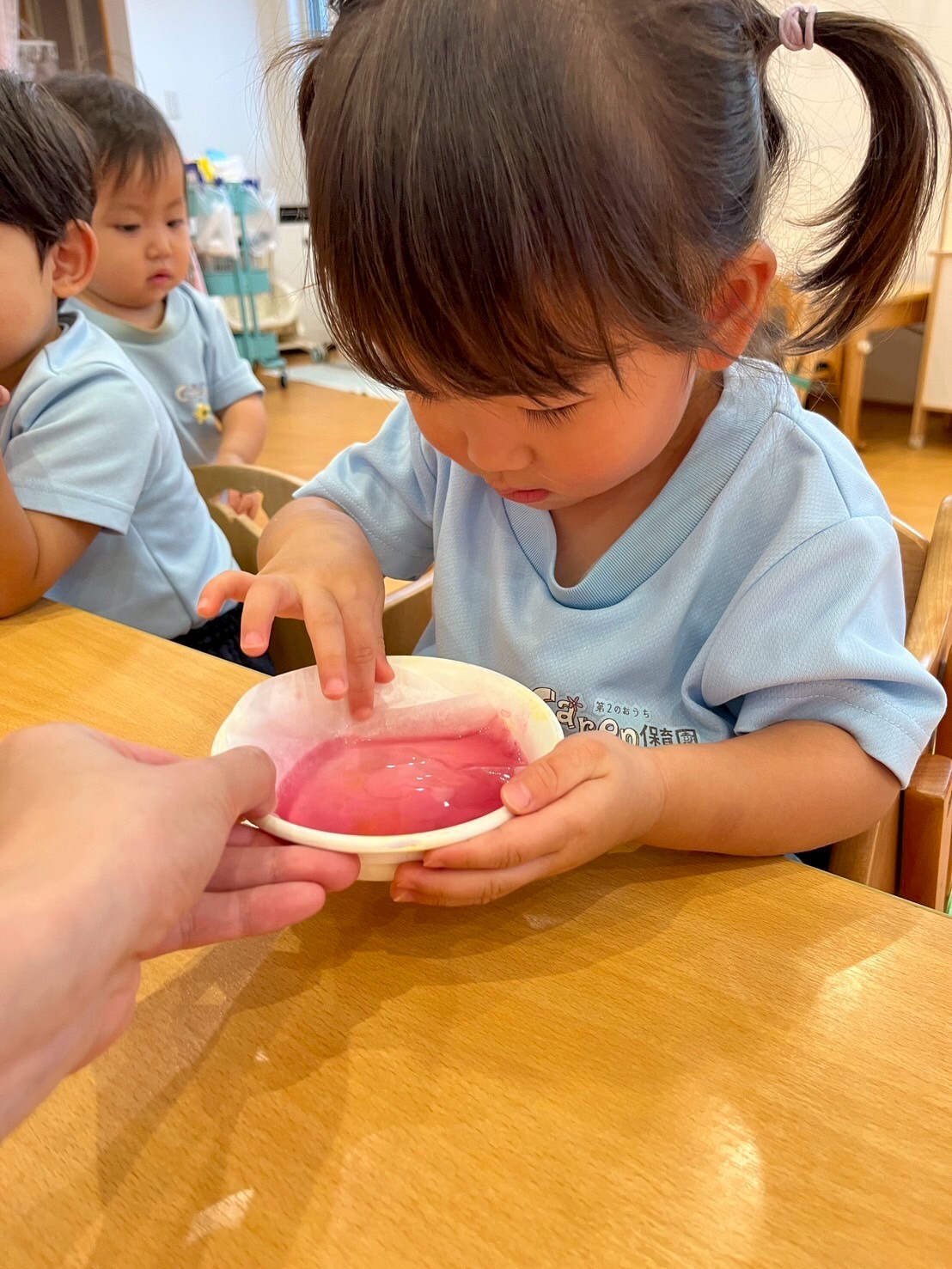 和紙に色水を付けて、うっすら色が付くと『きれいー😍👏』と大喜びでした🌺