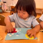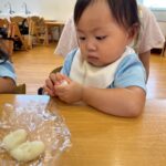 「べたべた」「くっつくよ」など感触を楽しんだ後はお月見の台紙にシール貼り☝️