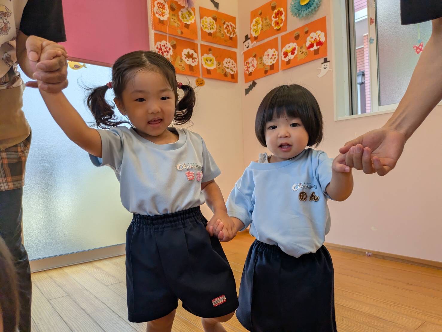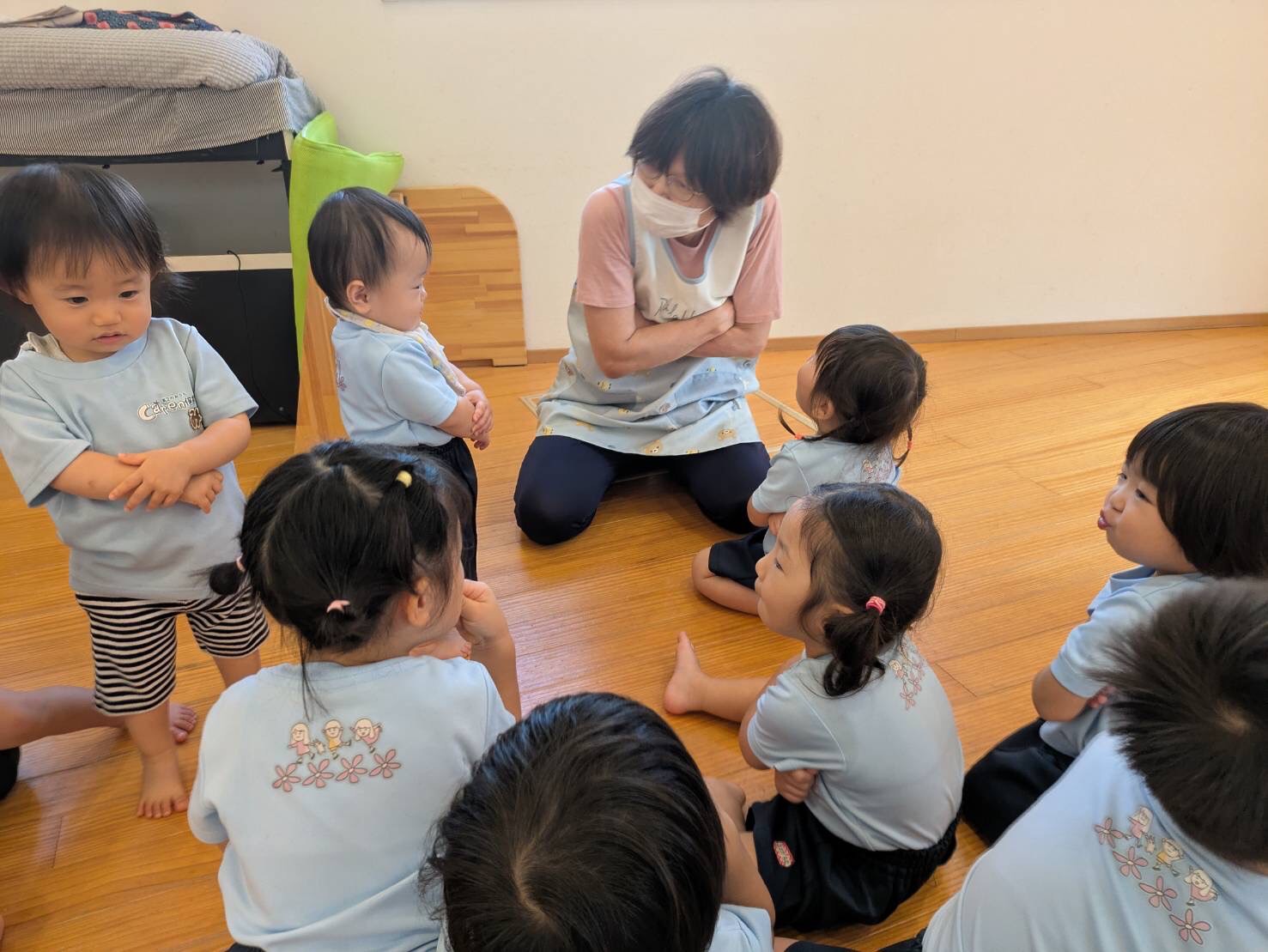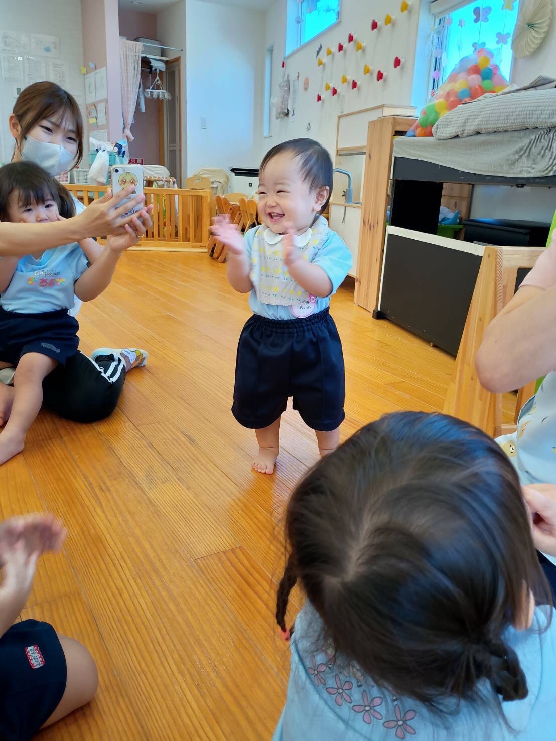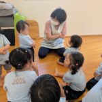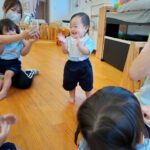 道中、パトカーや救急車、飛行機の大好きなな乗り物をたくさん見られて、大喜びな子どもたちでした♡散歩の後は、お部屋でみんなでわらべうた遊びをしました。