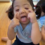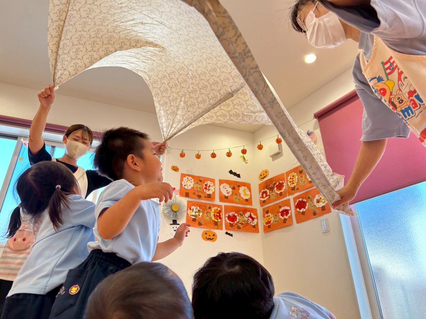 保育者の膝に座って『馬はとしとし』のお歌では『どすん!!』と床にお尻を落とされるとキャハハハハ〜!!と大笑い😆👏『うえからしたから』では大きな布で保育者がヒラヒラと布を舞わせると、大喜びで布の下に入って、寝転がったり手を上に向かって伸ばしたりして楽しんでいました🎶笑顔いっぱいの時間となりました♡