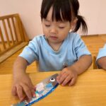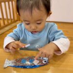 サンマにウロコに見立てたキラキラ折り紙を貼って、保育者の援助を受けながら、お皿になる折り紙も上手に折ることができました👏