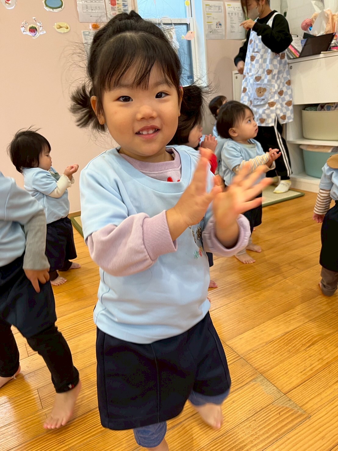 腕を動かしたり屈伸したりと、身体を大きく動かして体操することが出来ていましたよ😊✨その後はおまちかねの英語レッスンに参加しました🩷