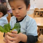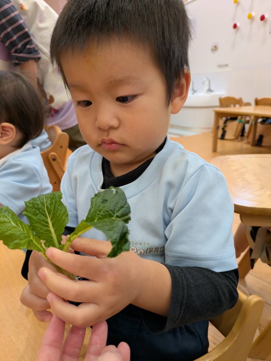 小松菜を触って感触を楽しみ、根元から優しく小松菜を取っていきました❤️