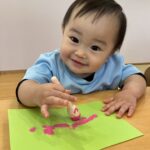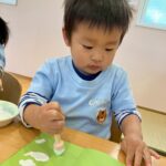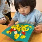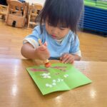 朝の会の後、絵の具遊びをしました✨デカルコマニーの技法を使って、クリスマスツリーを作りました🎄いろんな色が重なりあう様子に『きゃー💕かわいい💕』とニッコニコのお友だち!「私もやりたーい❣️」と小さなおててに絵の具をつけながら作り上げていましたよ✌️