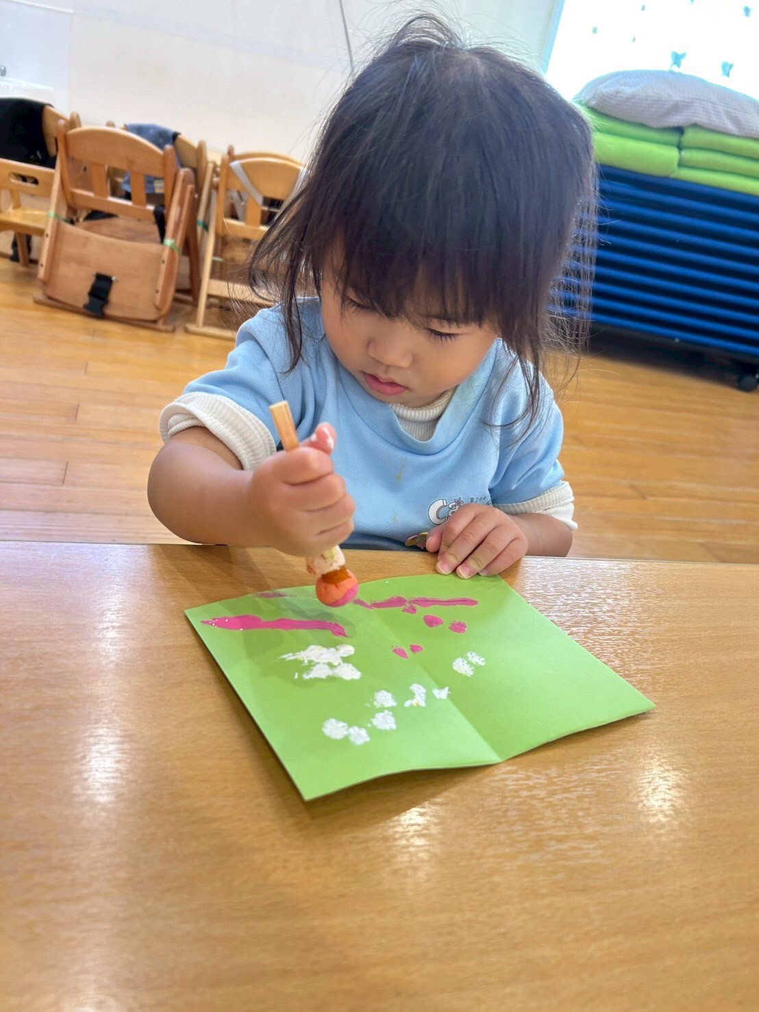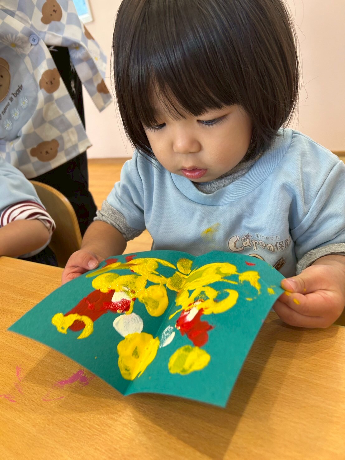朝の会の後、絵の具遊びをしました✨デカルコマニーの技法を使って、クリスマスツリーを作りました🎄いろんな色が重なりあう様子に『きゃー💕かわいい💕』とニッコニコのお友だち!「私もやりたーい❣️」と小さなおててに絵の具をつけながら作り上げていましたよ✌️