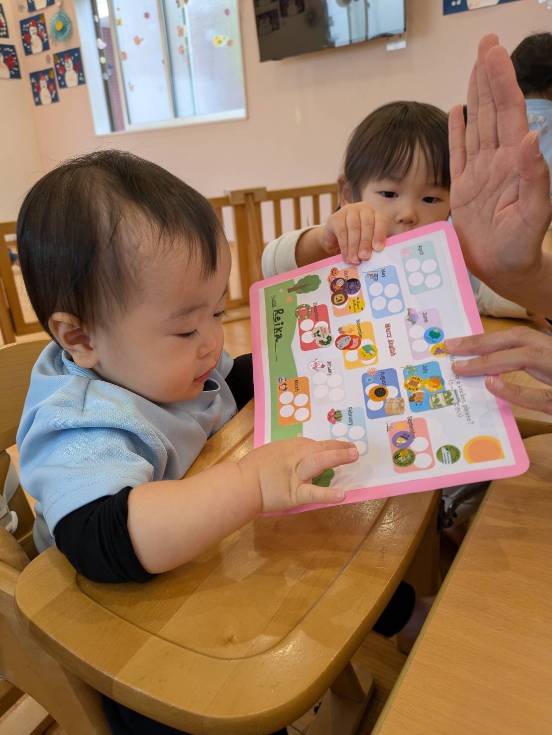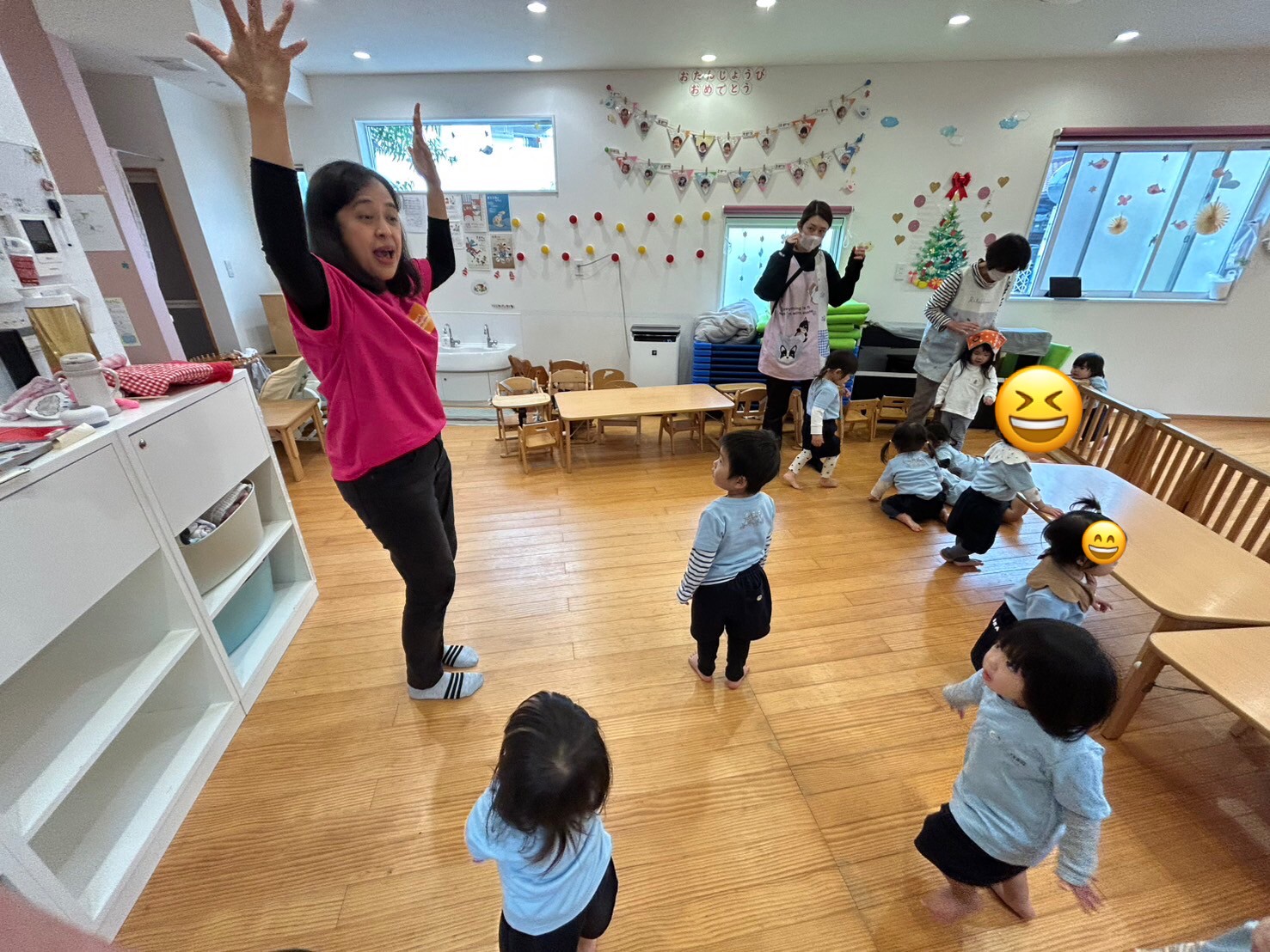 今日はイングリッシュがありました✨「クリスマスのかくれんぼ」という絵本を見てサンタクロースやトナカイ、クリスマスツリーをみながら英語で発音していきました😊「これは何?」というチャリナ先生の問いかけに「クリスマスツリー!」と元気よく答える園児さん😊