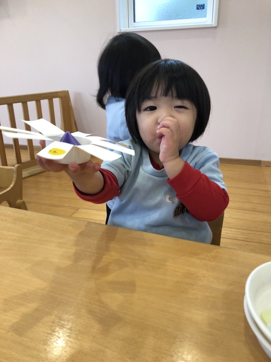高月齢児のりす組とひよこ組さんは室内でこま作りをして遊びました。