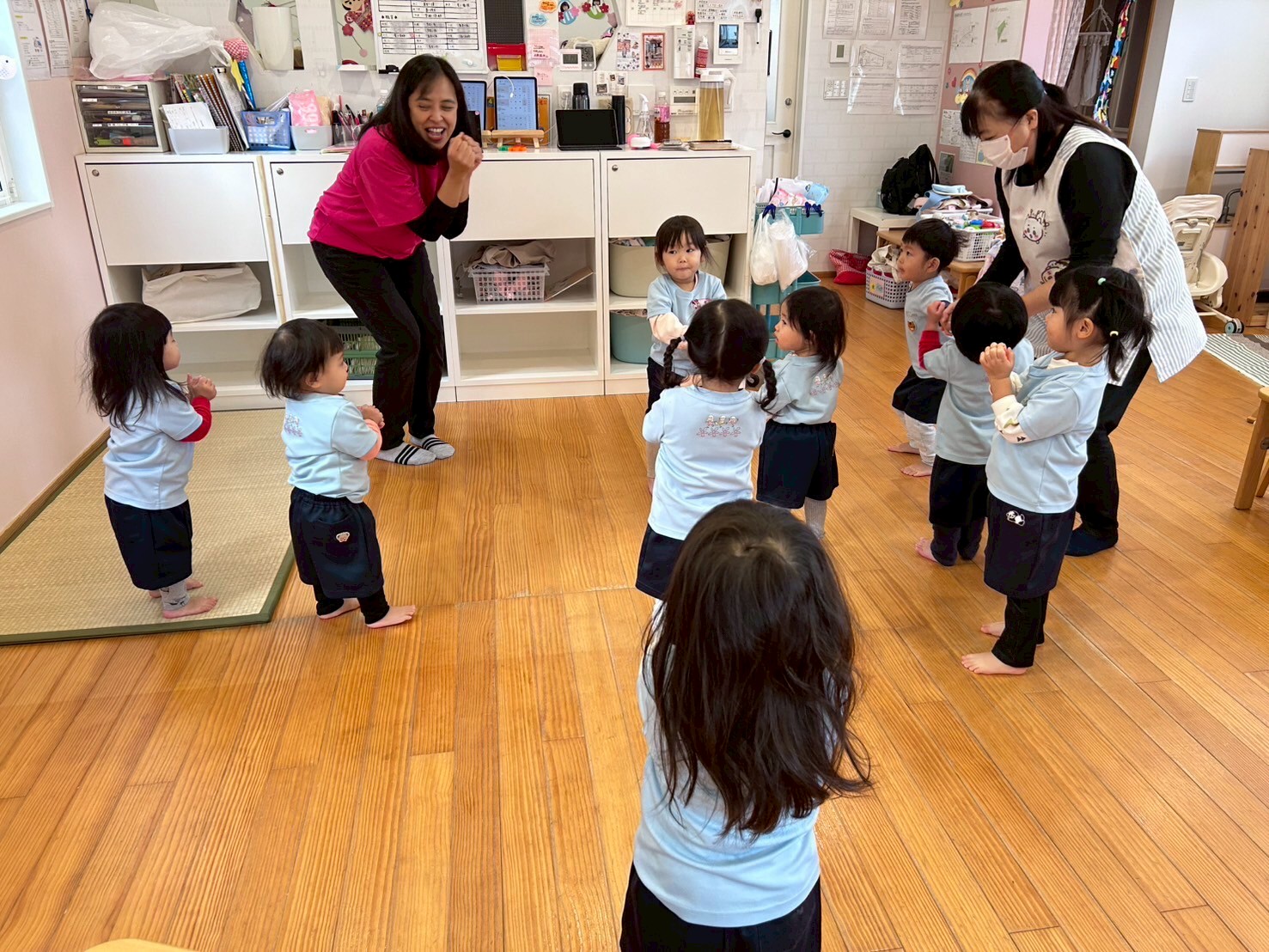 そのあとは、ダンスや体操をしてキャッキャ❣️とカラダがホカホカになったところで、「チャリナせんせ〜い✨!」とみんながドアの方に声をかけてみると、、