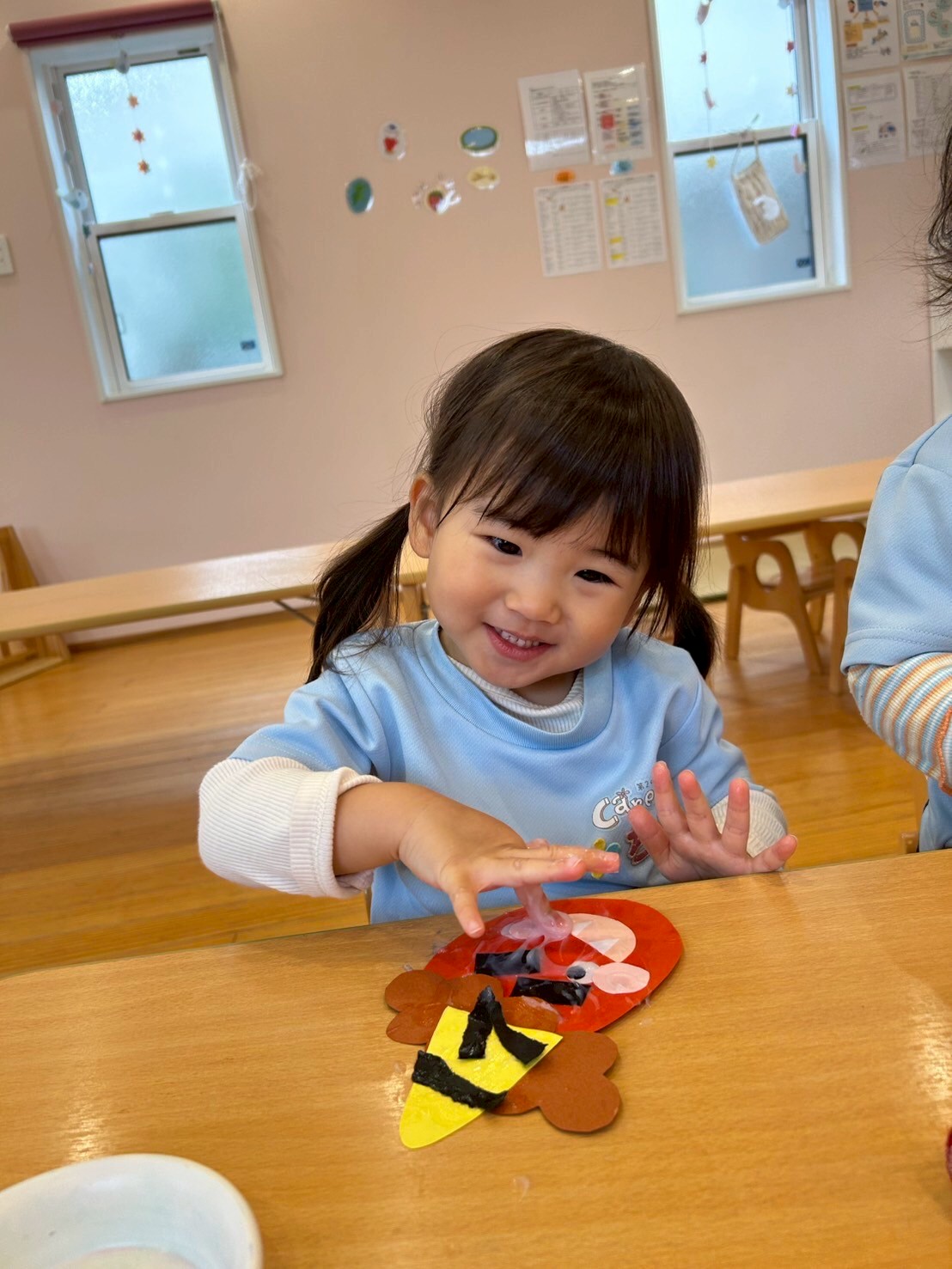 その後は節分の製作をしました✨鬼の顔のパーツを糊付けして