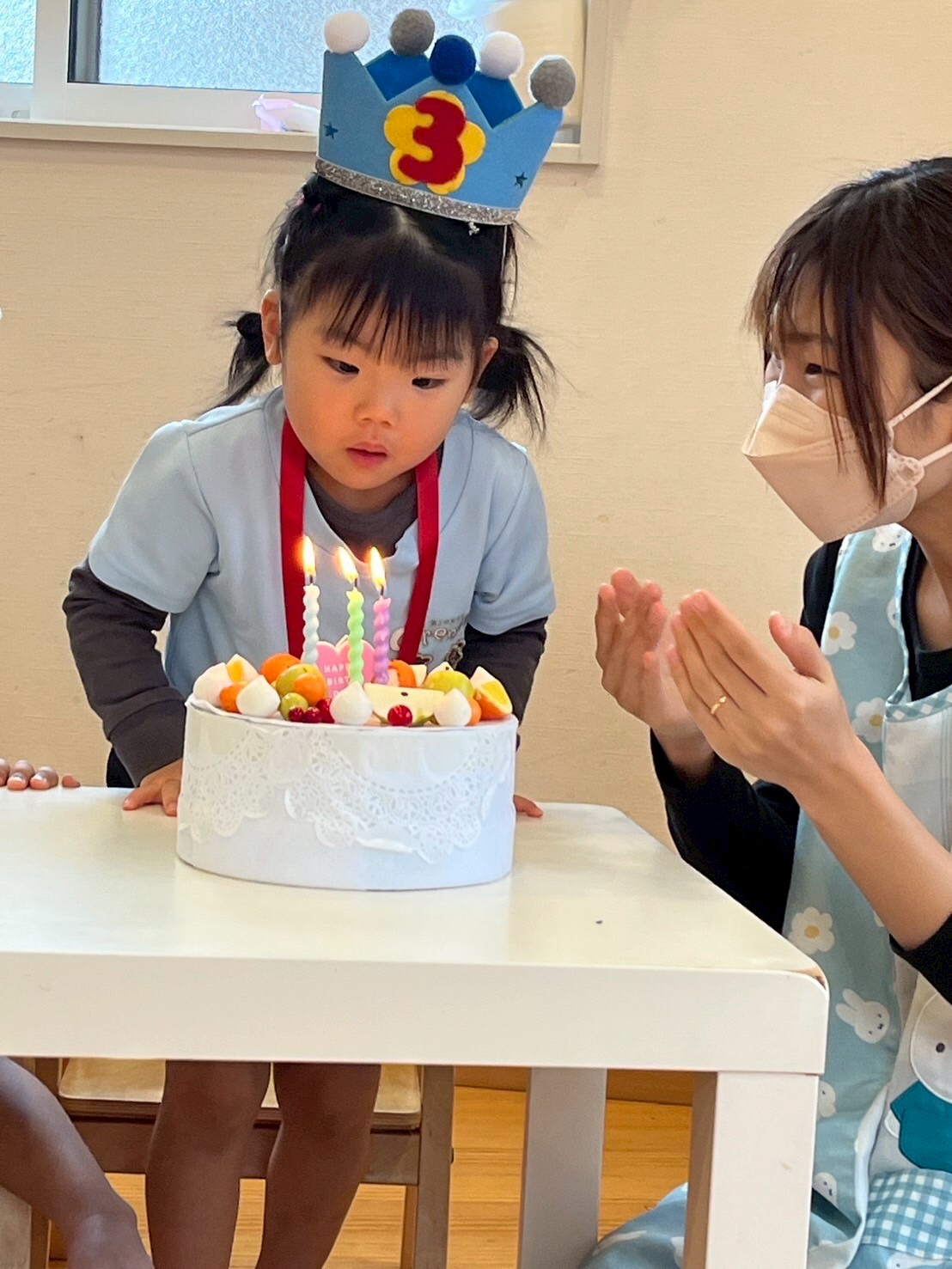 ケーキのロウソクを吹き消して、みんなから大きな拍手をもらい、嬉しそうな笑顔が見られました😍🎂先生たちからの出し物は先生当てと音当てゲーム!