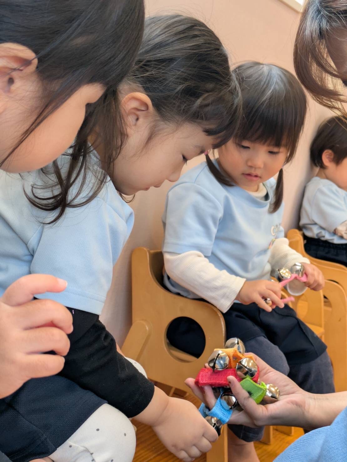 鈴を手につけてボディパーカッションをしたり、かわいいたまごの形のマラカスで「たまごまごまご」のお歌を歌ったり…今日は楽しいリトミックの日でした😊