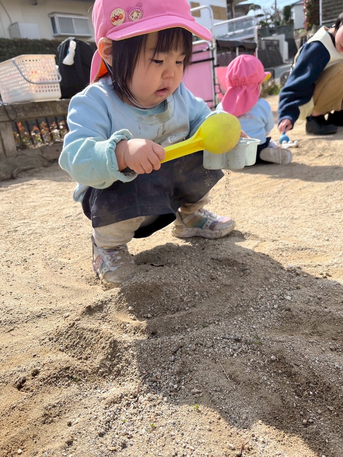 先生が砂山を作ると、平に戻したり、自分のバケツに移したり、砂遊びを思う存分楽しみました✨