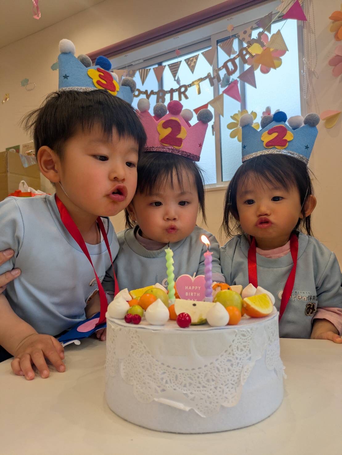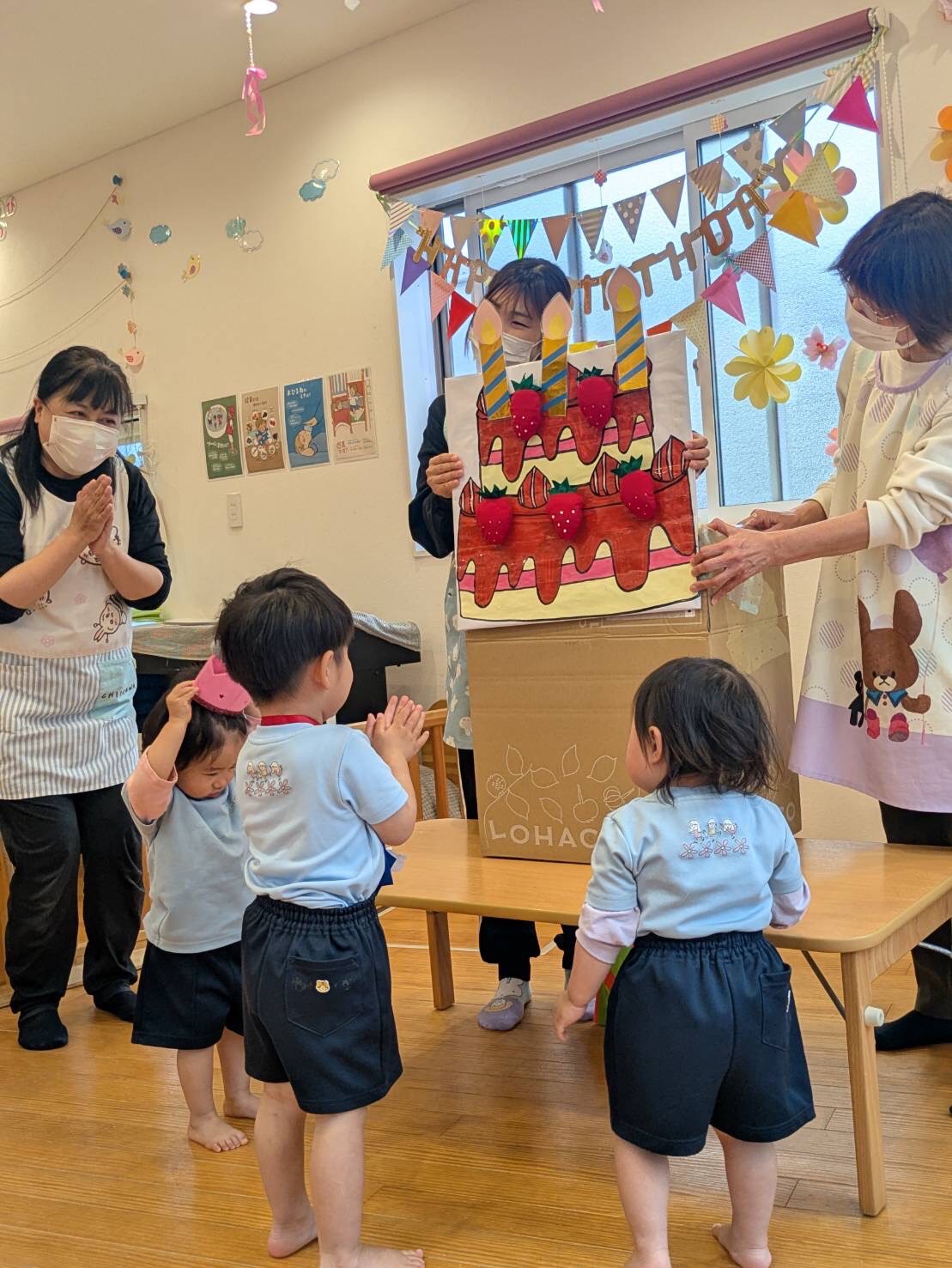 誕生ケーキのロウソクをみんなでふ〜っと吹き消す姿が可愛くて可愛くてたまりませんでした👦👧👧♡先生たちからの出し物では、たまごのペープサートで可愛い動物たちが出てきたり、クッキングをしながら大きなケーキが出来上がり、3月生まれのお友だちとビッグストロベリー🍓をトッピングして完成させました🎂