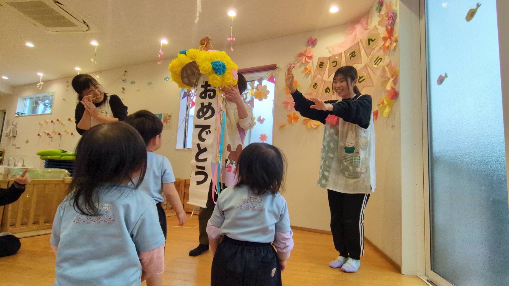 マジックでは仕掛けにちょっぴりびっくりしていたお友だちもいましたよ🫢最後は、3月生まれのお友だち3人で大きなくす玉をわって「おめでとう〜👏」と盛りだくさんでお祝いをしてもらい嬉しそうに笑顔を見せてくれました💕