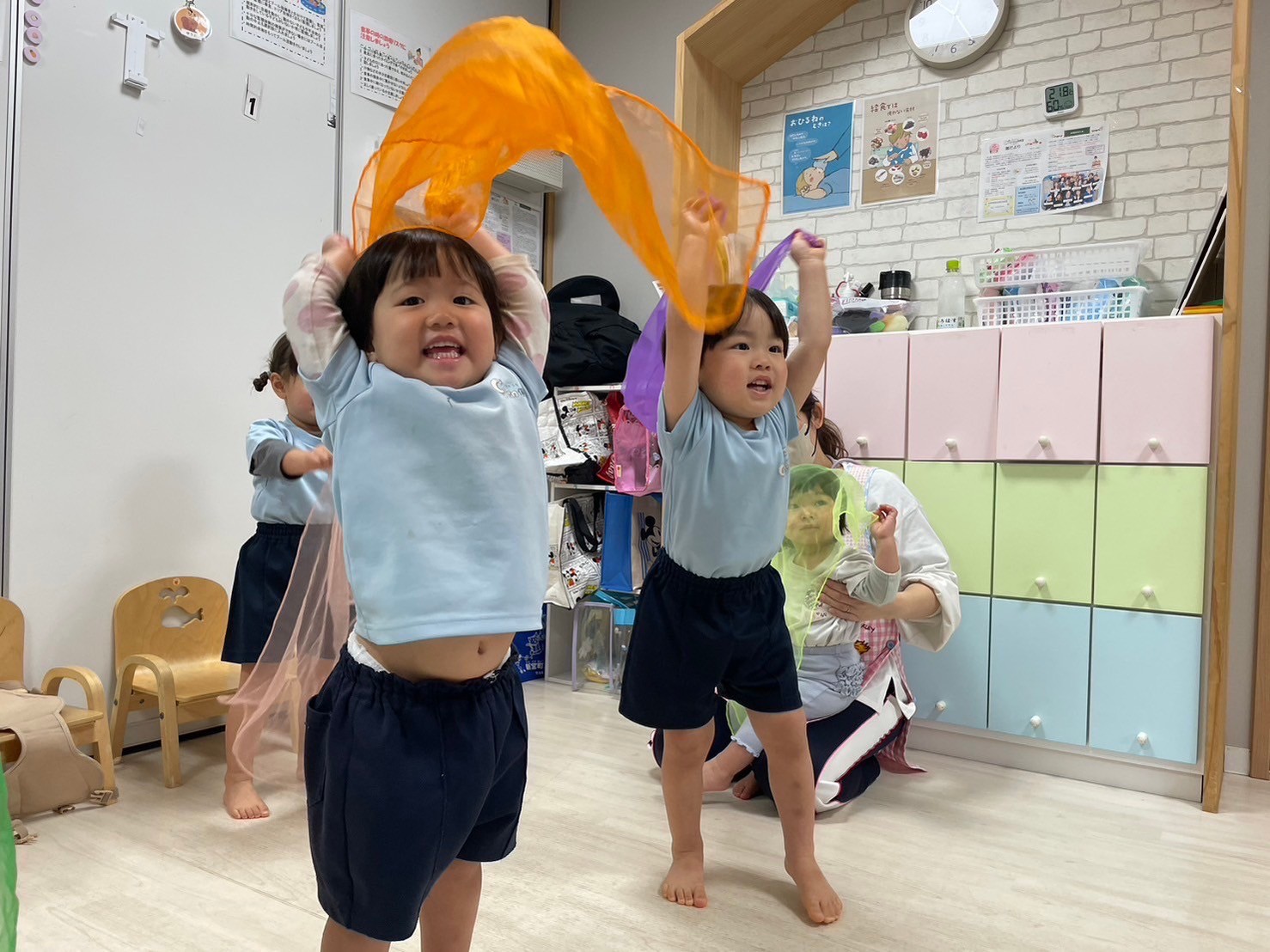 アコーディオンを弾かせてもらったり、カラフルなスカーフでリズム遊びを楽しんだりして、新入園児のお友だちもみんなも笑顔いっぱいに大喜び🥰