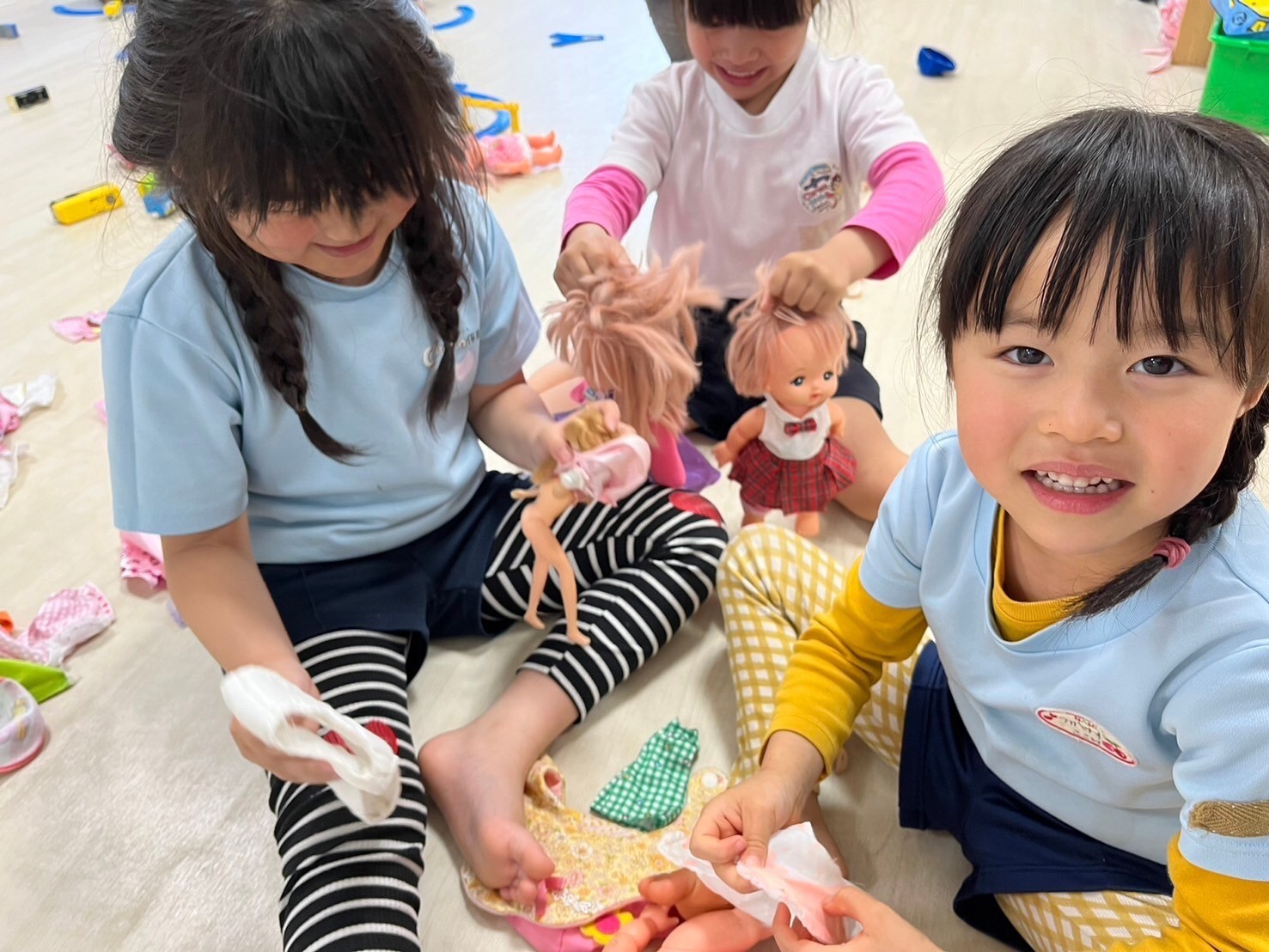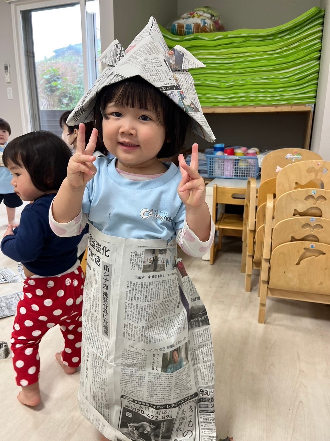 新聞紙を上手に破れる子も増え、手先の力がついてきているのも感じられましたよ✨色々な見立てを楽しみながら、積極的に料理や服を作って保育者や友だちに次々と見せて喜んでいました😍