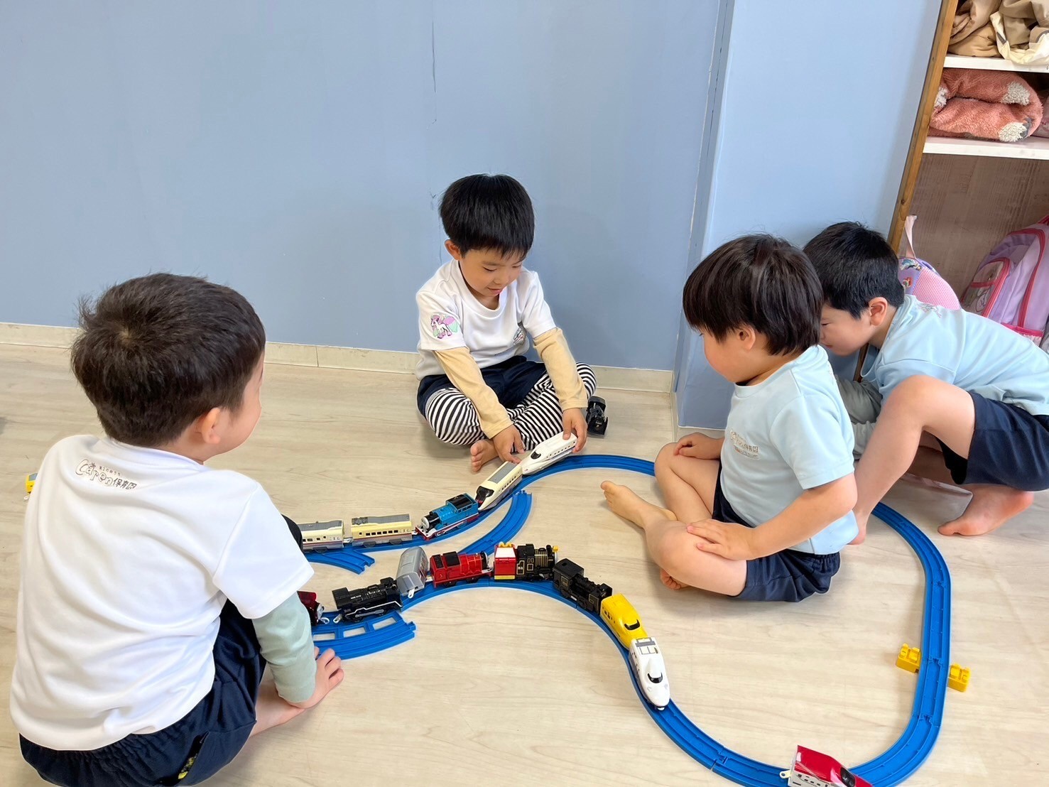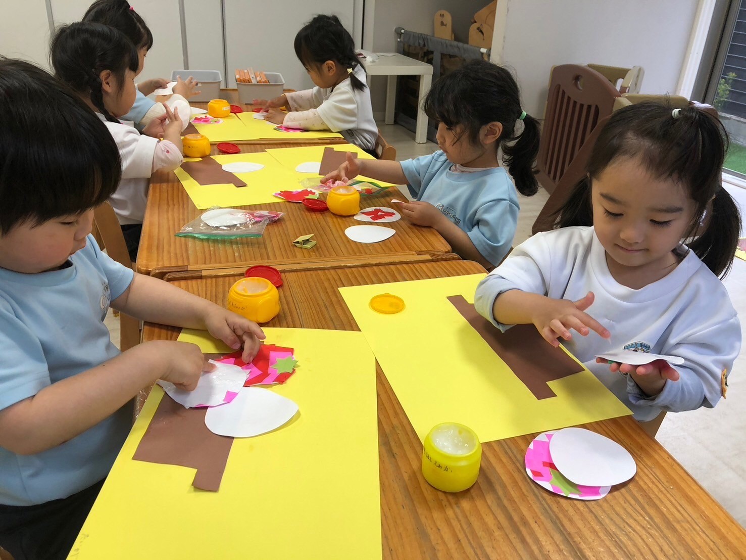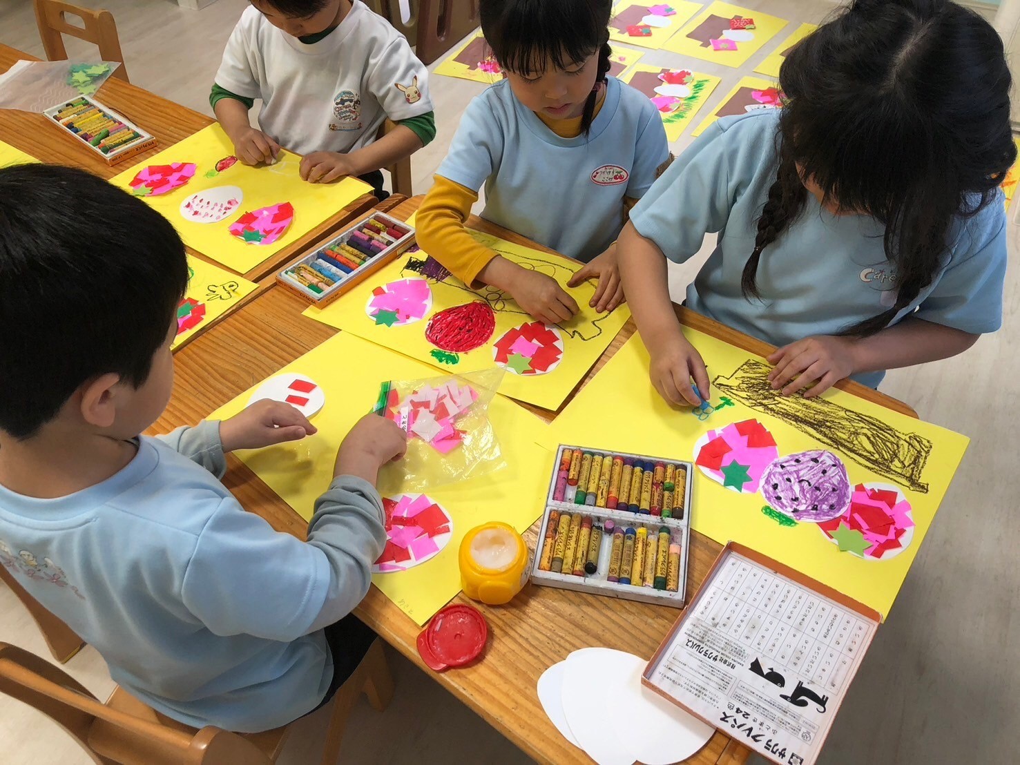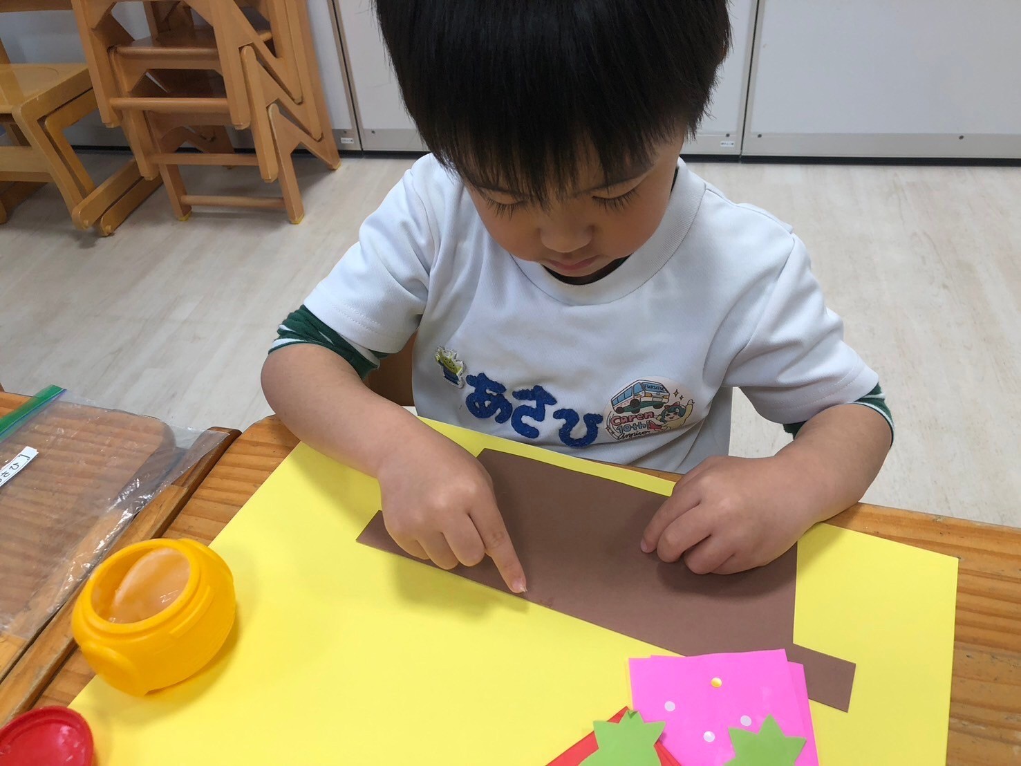 今日はあいにくのお天気で、製作の続きをしました🍓✨画用紙に貼り付けし、葉っぱや茎を描いていよいよ完成間近💖うさぎ組さんは糊の使い方や量に気をつけながら、こあらさんは糊のつける場所にも意識しながら作業を進めましたよ🤗きりんさんはさすがの絵心でこだわりを持った作品となりました🌟待ち時間には、プラレールやメルちゃんで遊びましたよ❣️