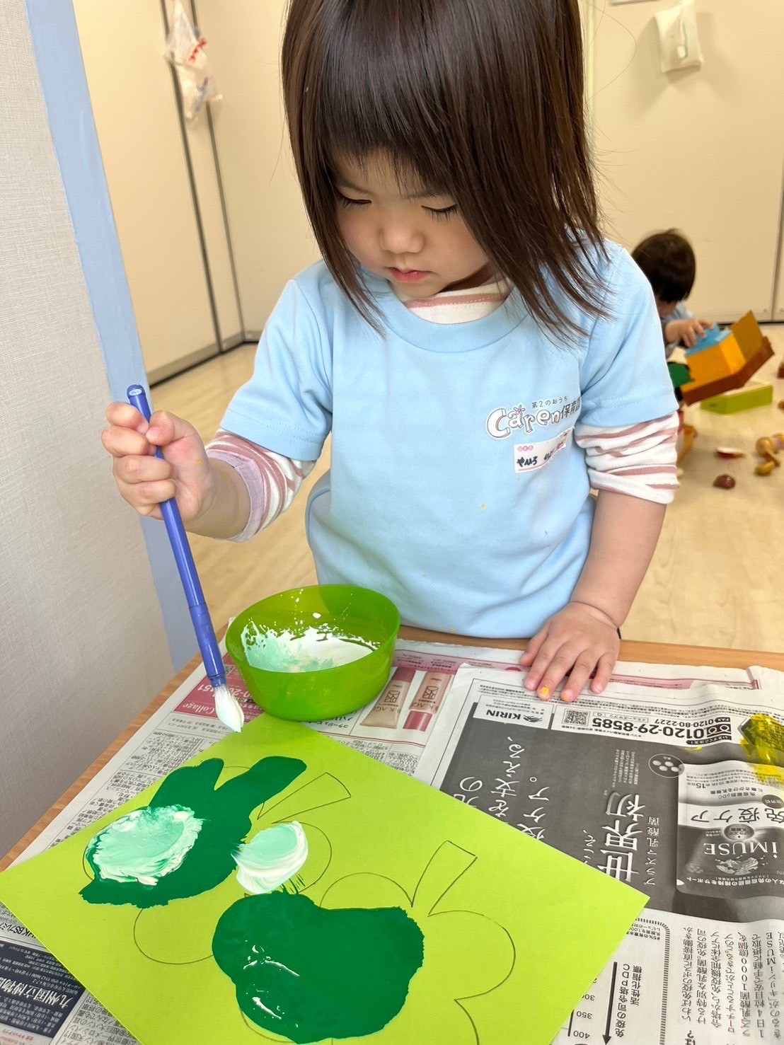 今日は絵の具を使って幸せのよつばのクローバーに色つけをしましたよ🍀💕