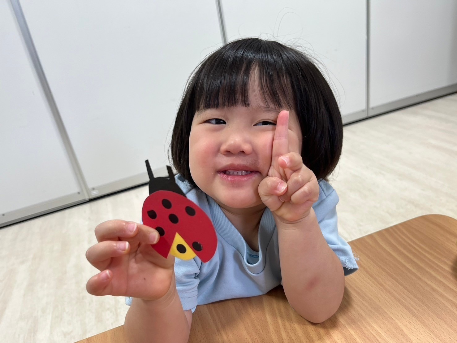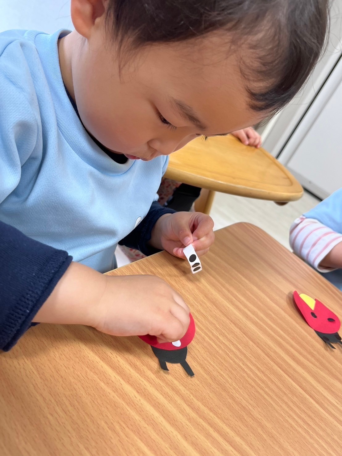 てんとう虫のシール貼りでは模様だけでなく、目や鼻に見立てて自分から貼る子もいて、想像力の豊かさに感心しましたよー🥹💖✨✨