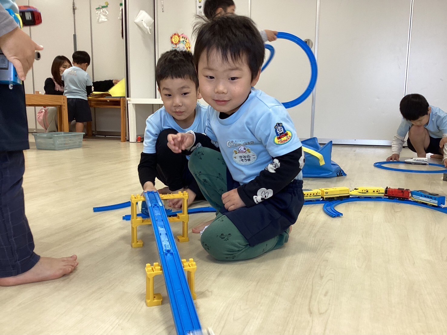 今日は英語レッスンの日🌟色のカードや絵本を見て、色の名前を覚えましたよ😊中には、レッスンの内容をすぐに取り入れおもちゃの色を英語で言う子もいました☺️💕お部屋遊びでは、プラレールとシルバニアに分かれて遊び、プラレールではて転がしで競争したり、シルバニアでは役になりきって演じる女優がたくさんいました😚❣️じっくり遊び込むことが出来て満足そうなみんなでした😚👏