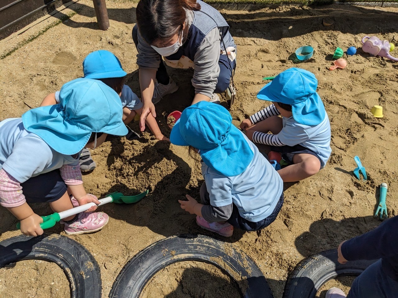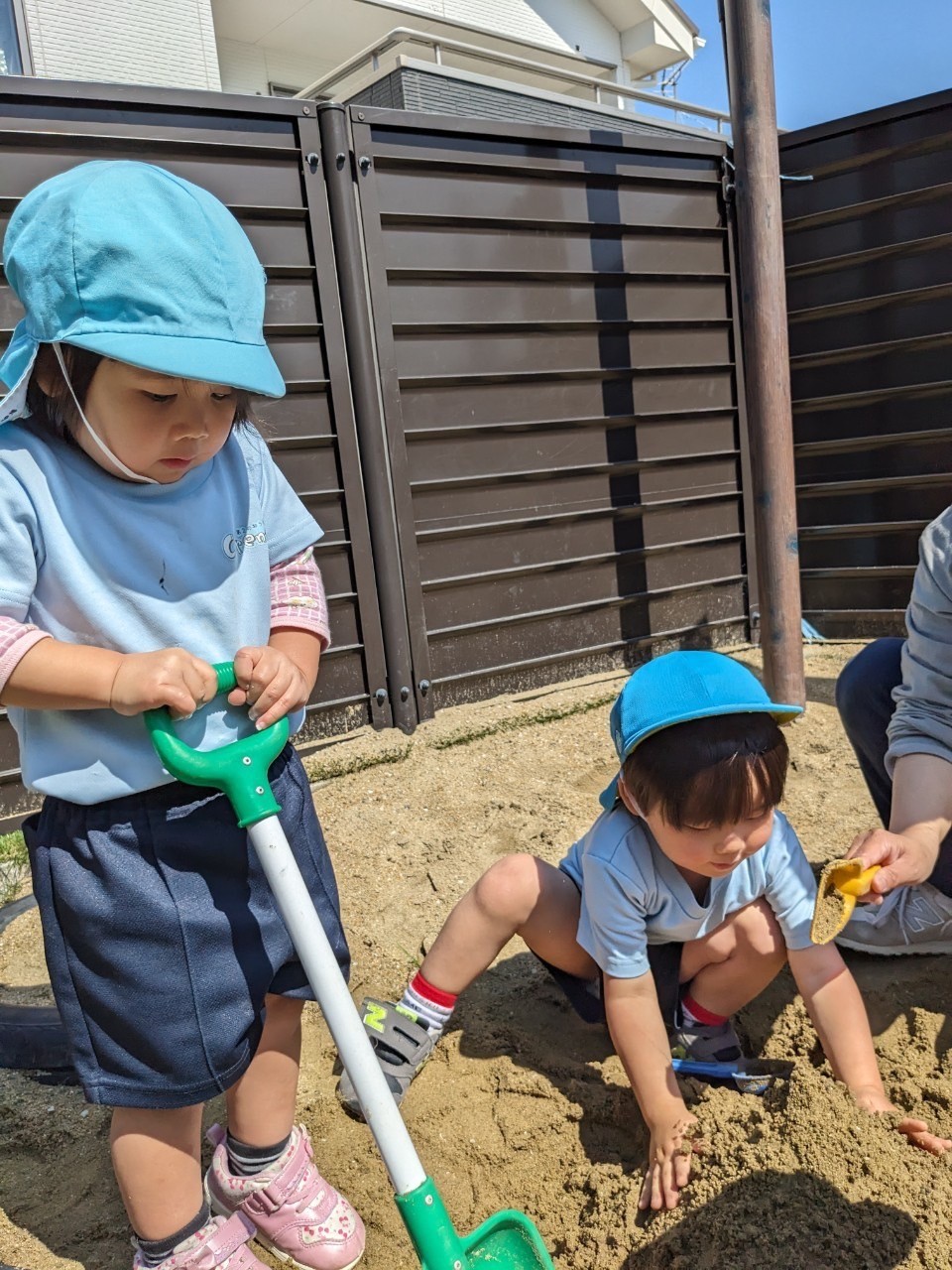 砂場では「あかちゃんのごは〜ん」と言ってお料理したり保育者と一緒に大きな砂山を作ったりして楽しみました💕