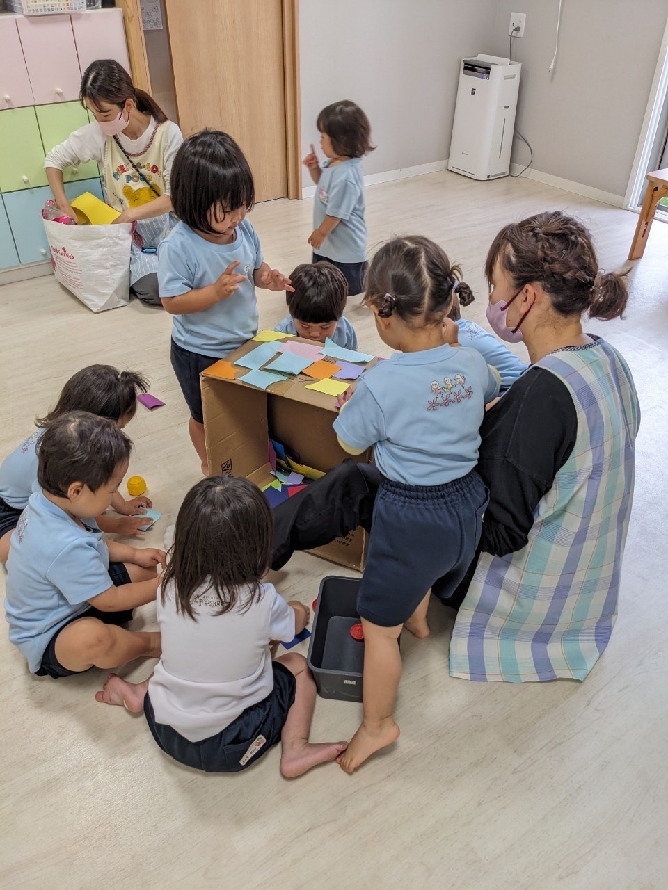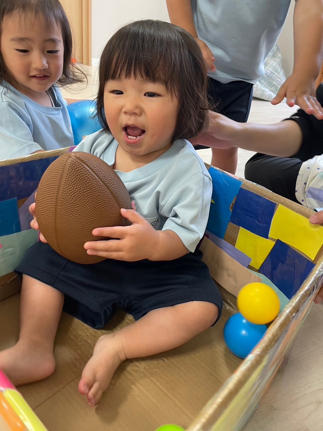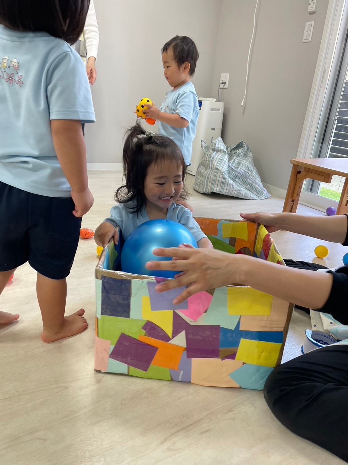 絵本の先生の読み聞かせを楽しんだ後は、みんなで協力してダンボール飾りつけ遊び📦✨