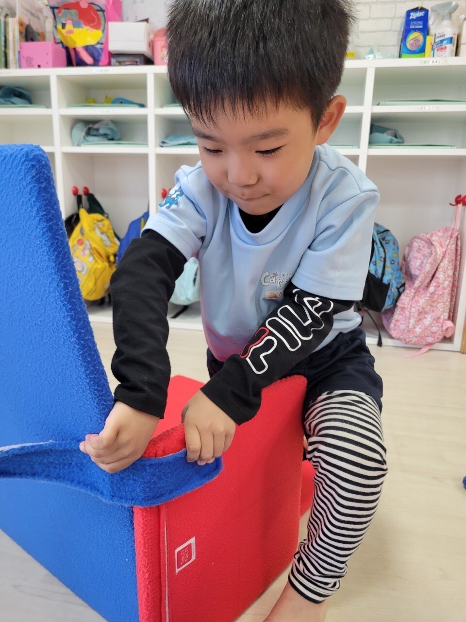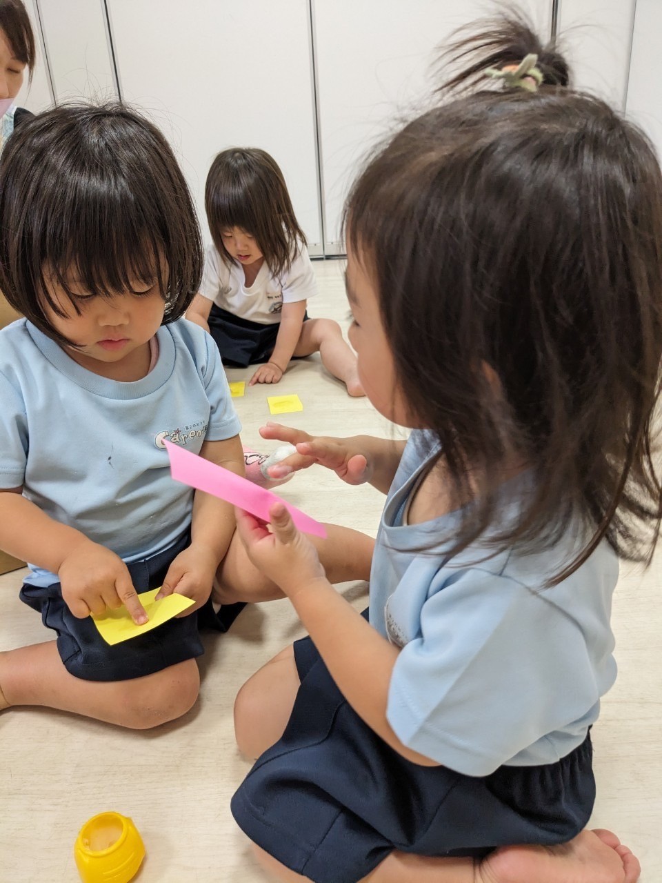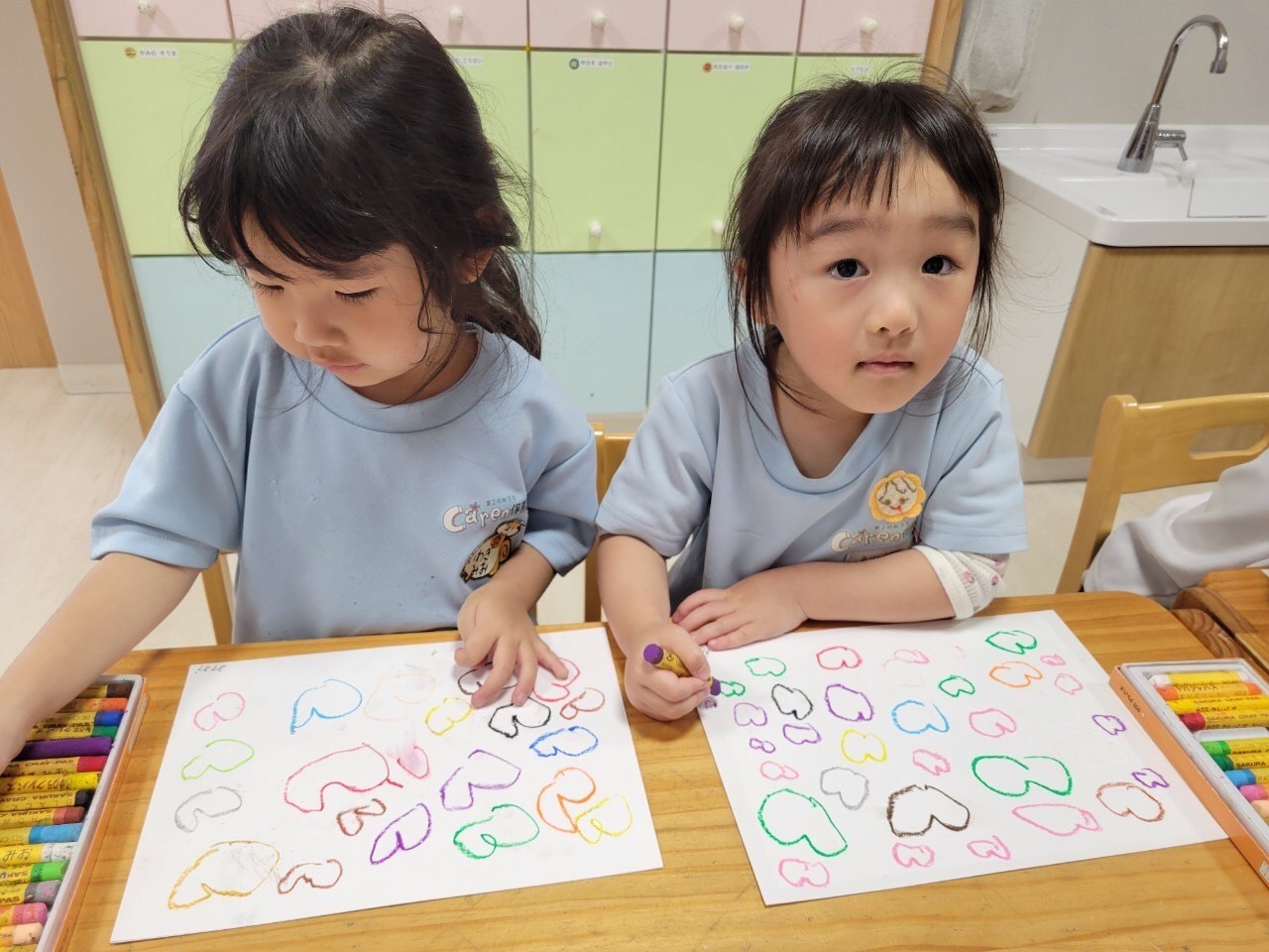 その後は、6月の製作に向けて傘やレインコートの模様を描き、待ち時間にはマットをつなげて遊びました❤️
