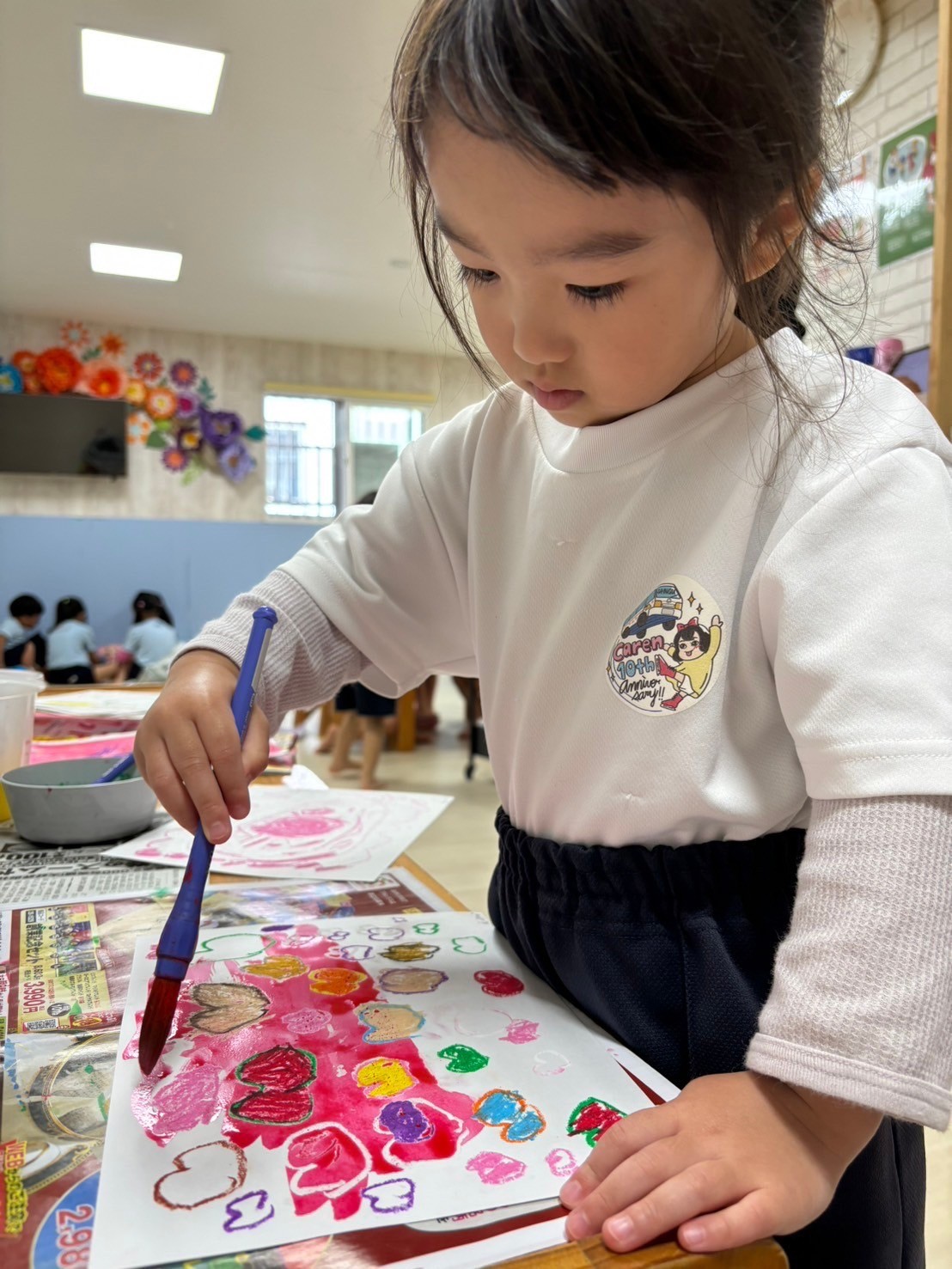 今日は英語の日🌟『red light ,green light』の元気な歌に合わせて1日がスタートしました💖歌に合わせて動いたり、止まったりする動きが面白いようです😆レッスンでは動物カード見て答えたり、シルエットを見てその動物のカードを見つけるゲームをしたりしましたよ🥰みんな自分の番になると、積極的に自己紹介をして取り組んでいました❣️待ち時間にはみんなで『あぶくたった』をして遊んだり、塗り絵や園庭、ぬいぐるみなど好きな遊びをしましたよ☺️園庭では早速自分たちで覚えたての『あぶくたった』をしている姿もありました😍製作の続きで昨日の模様に絵の具をつけてはじき絵も楽しみました😊