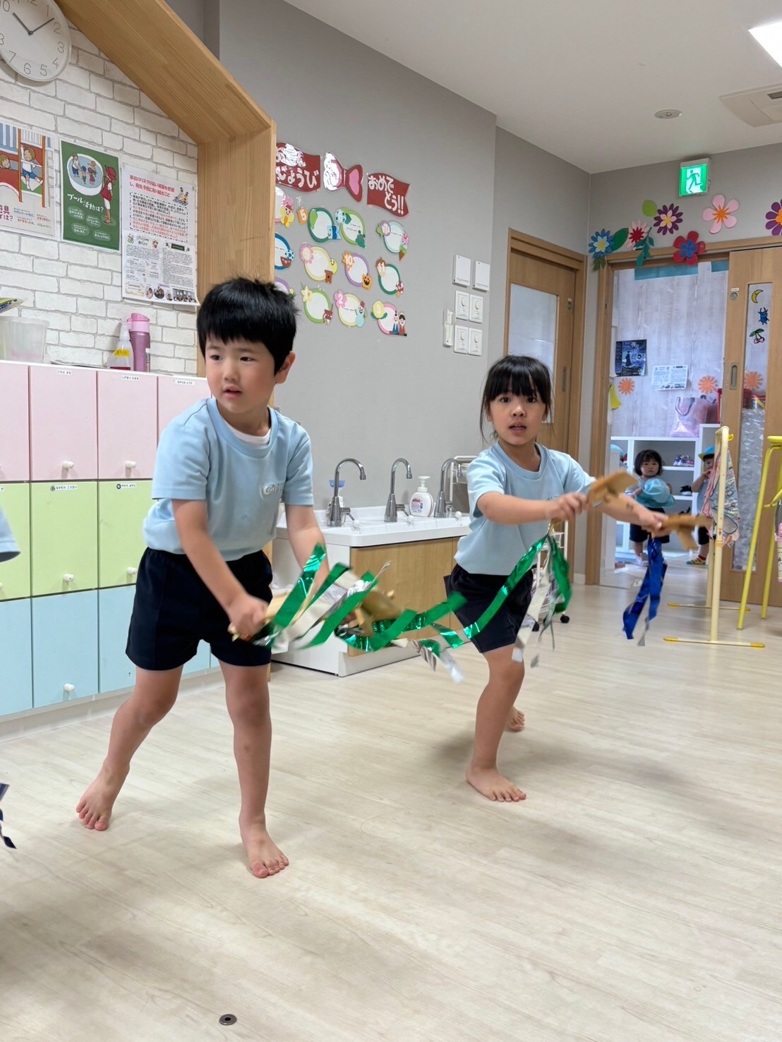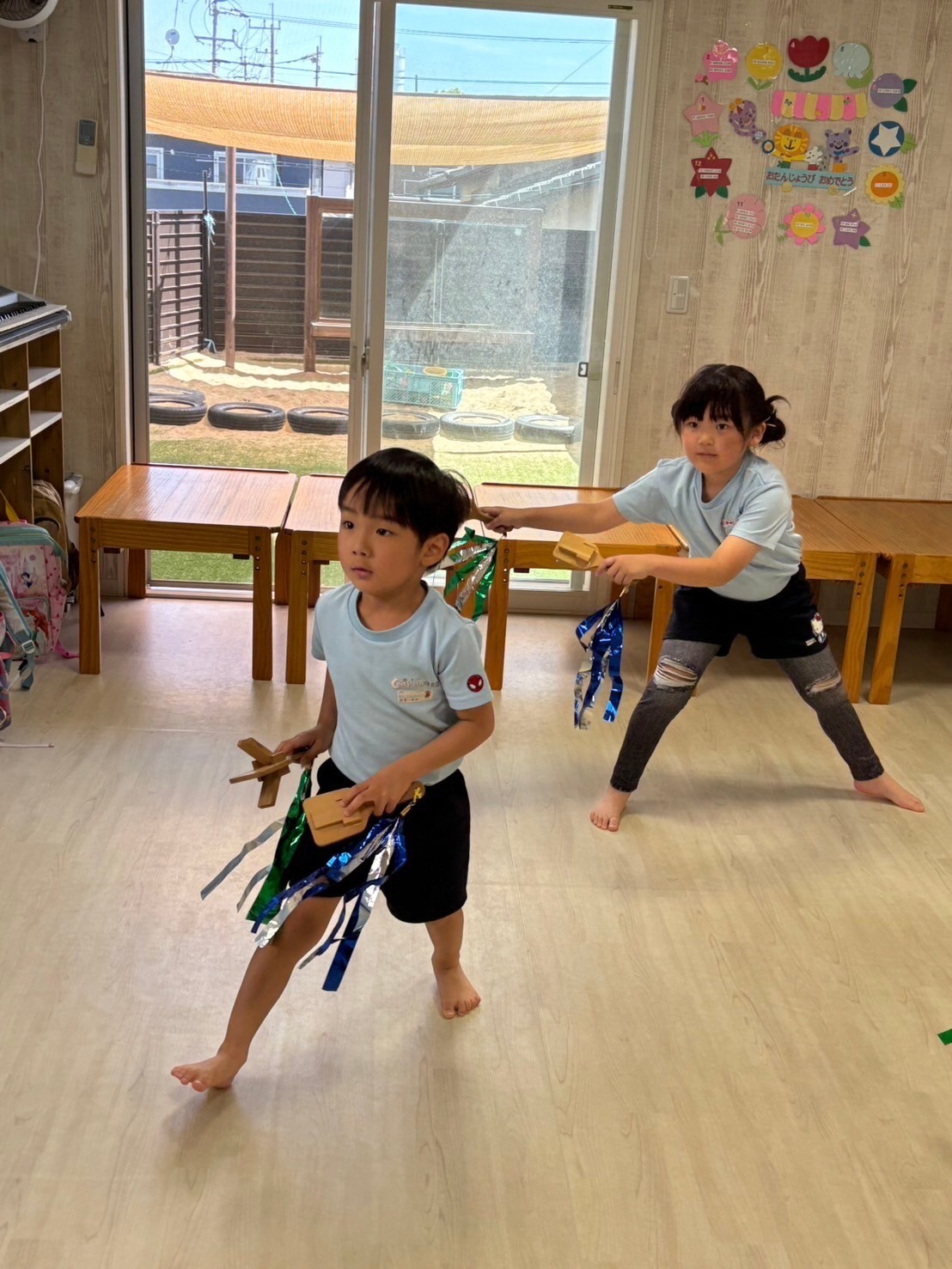 鳴子を持っての本格ソーラン節一つ一つ動きを確認しながら取り組みました💜