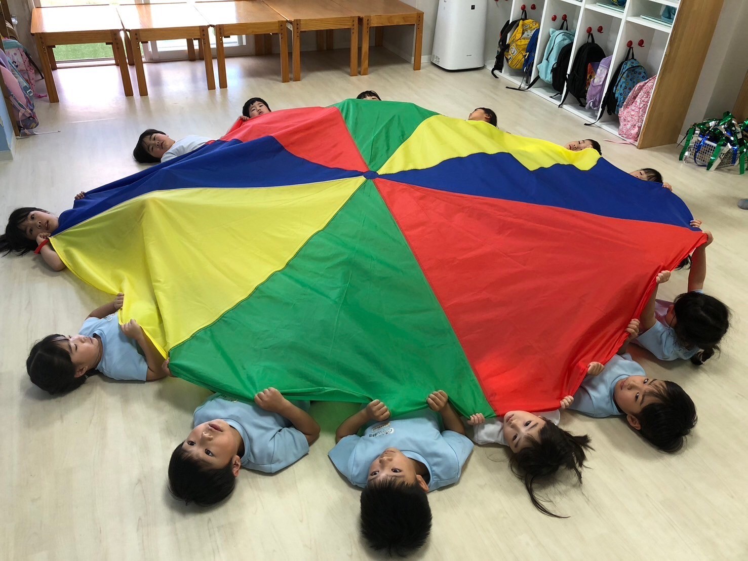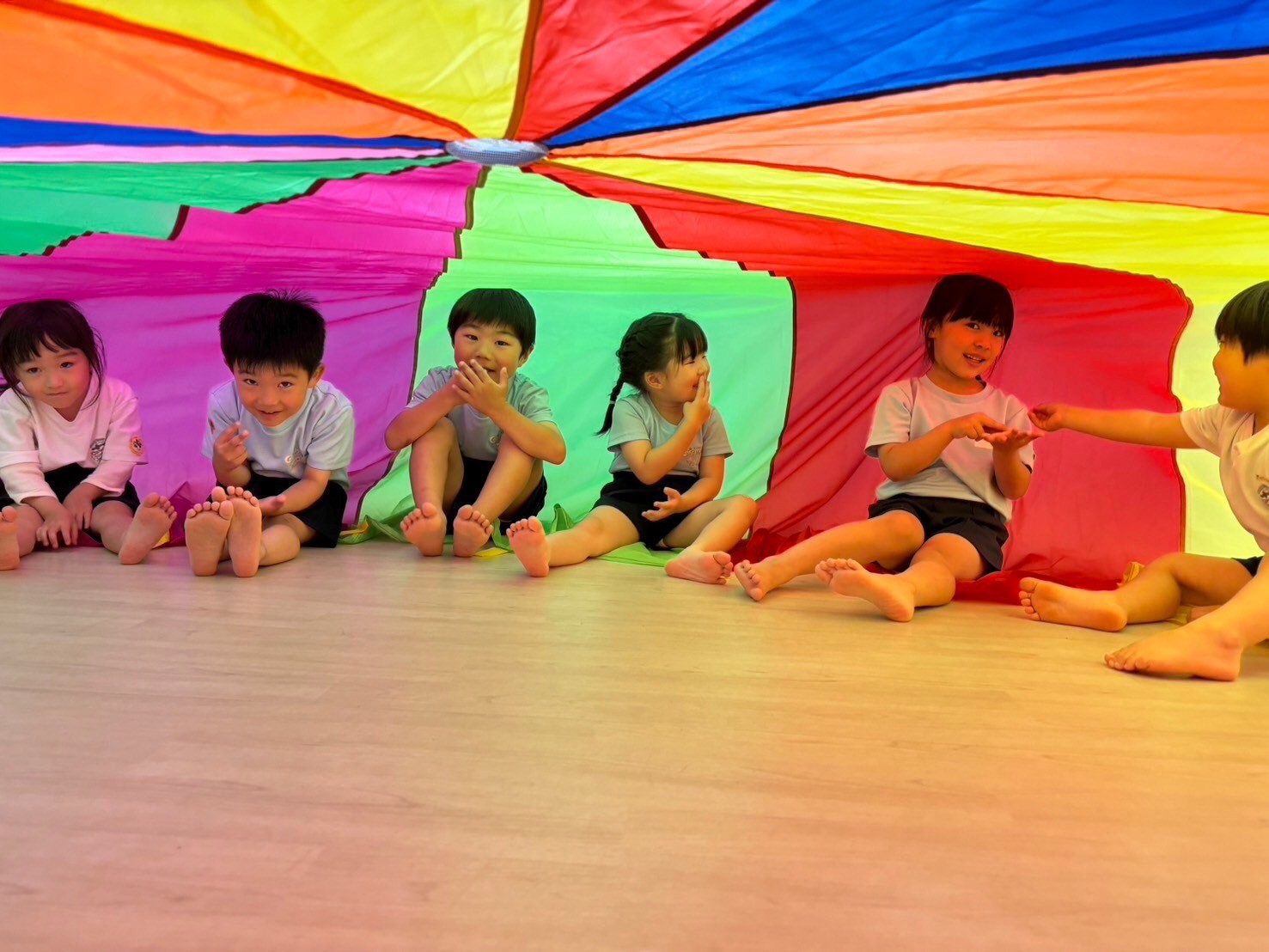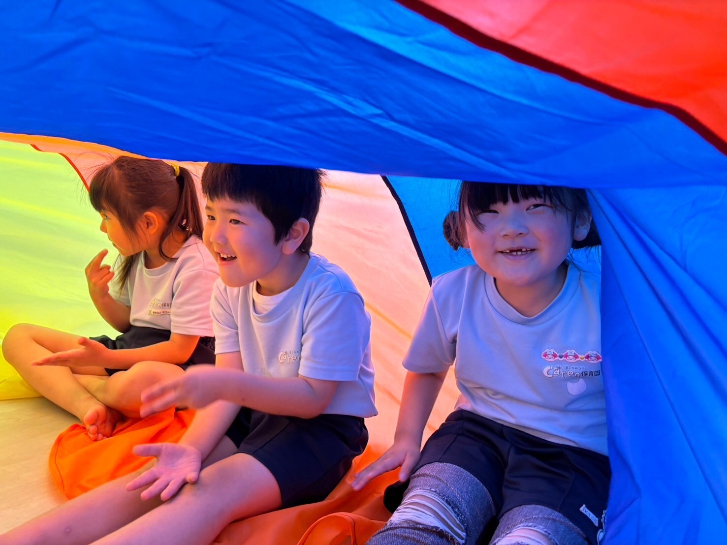パラバルーンのではみんなで気球やテント、メリーゴーランドを作りました🌟大きなお山が出来上がると歓声があがっていましたよ💖