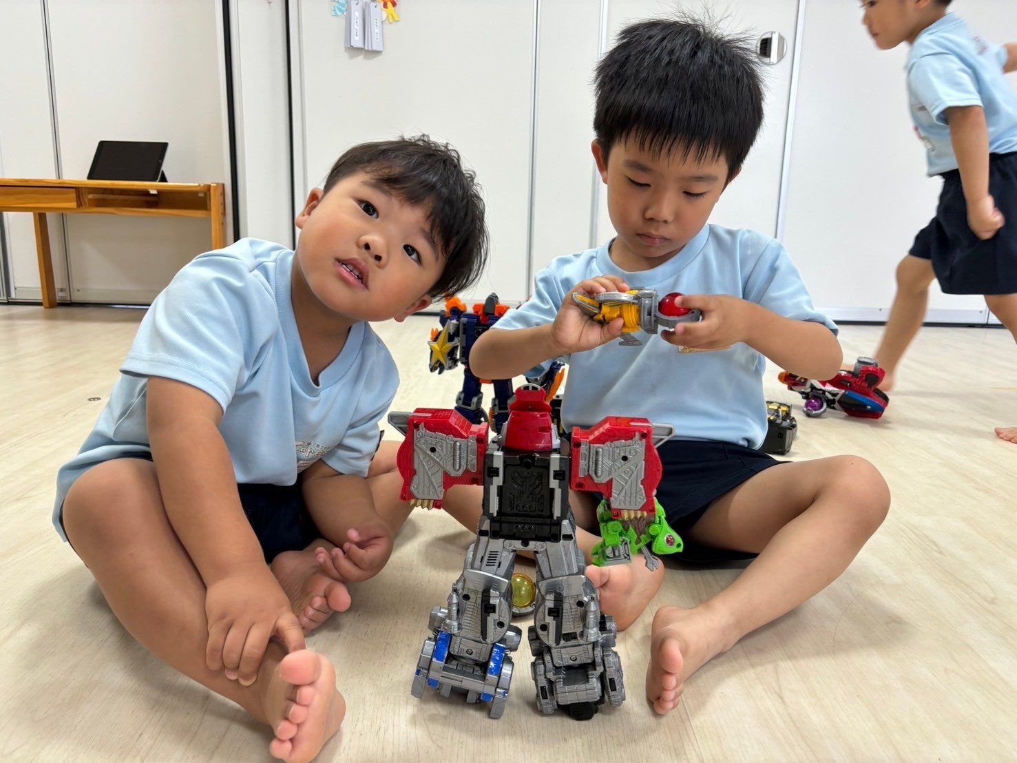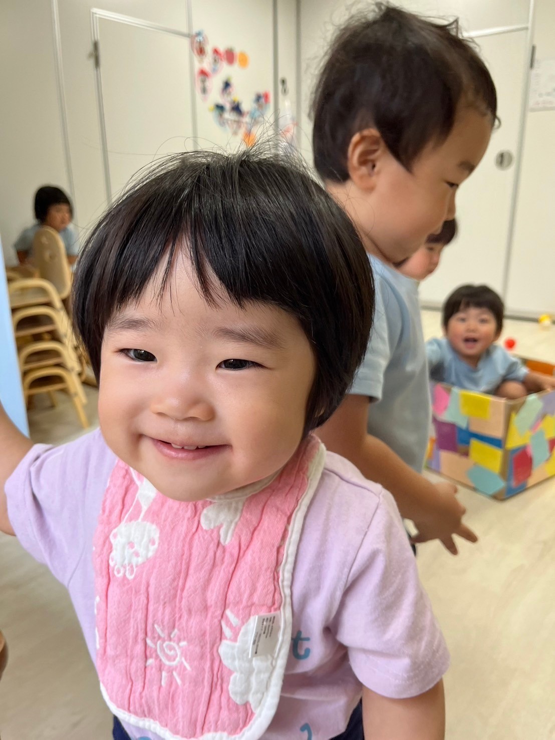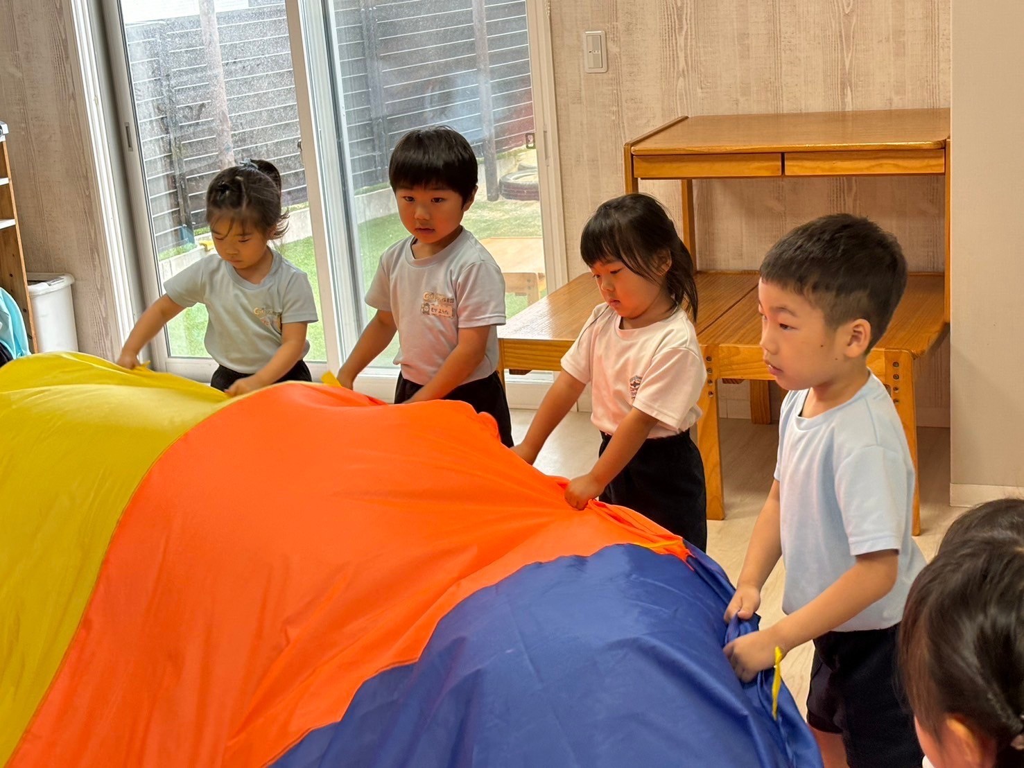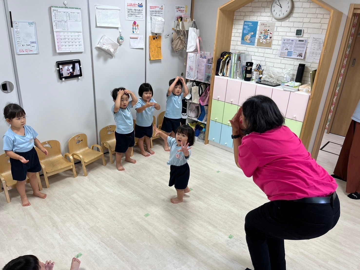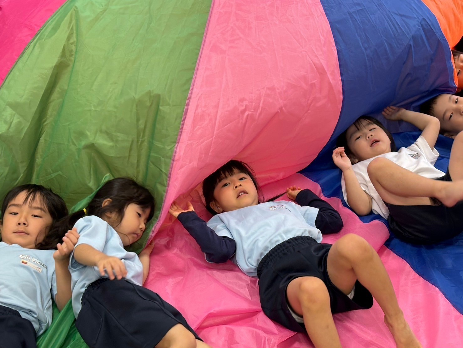 今日は英語レッスンの日⭐️乗り物シリーズと形シリーズの単語カードが登場❣️新しいカードに興味津々でたくさん発音しながら楽しみましたよ😊待ち時間には『あぶくたった』をして遊び、鬼の子を戸棚に入れて、お家に帰ってからすることを自分たちが普段していることを想像しながら「ゲームをする!」「お風呂に入る!」とイメージを広げて盛り上がっていましたよ☺️🩷きりんこあらさんはパラバルーンの練習もし曲の流れをつかんできたようで、元気に声も出しながら励んでいました😆🎵 最後には、室内で好きなおもちゃで遊んだり、園庭で鬼ごっこや砂遊びをしてゆっくり過ごしました🥰