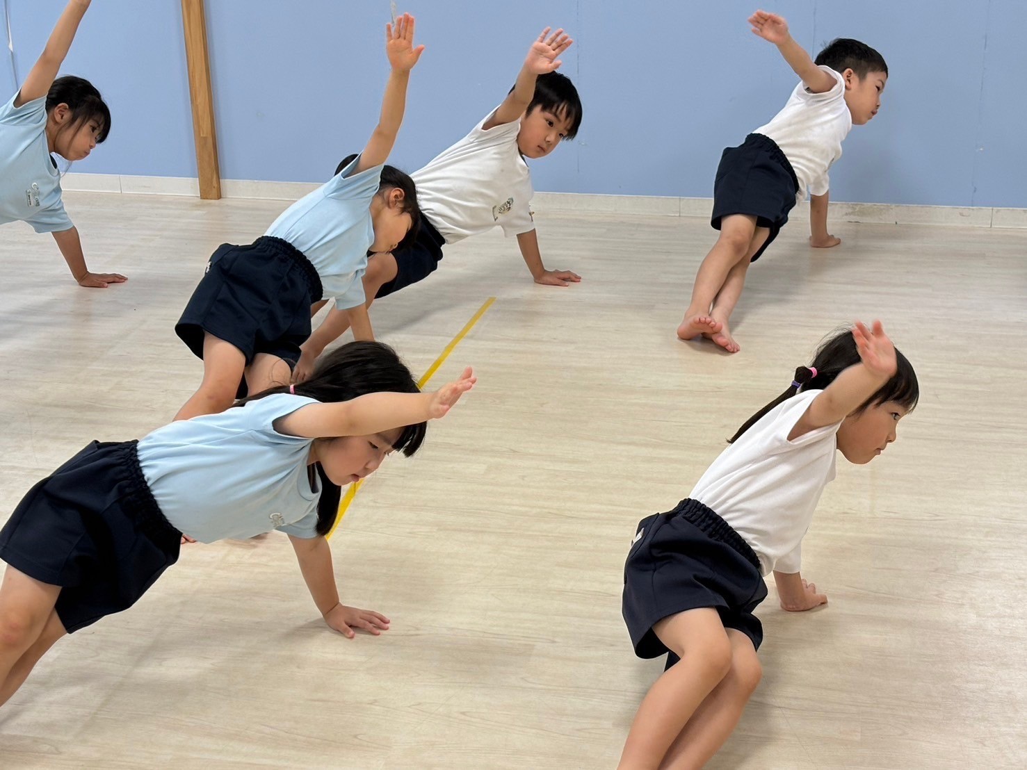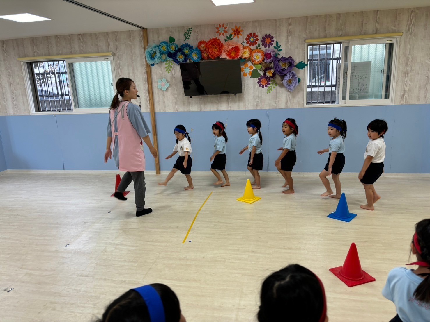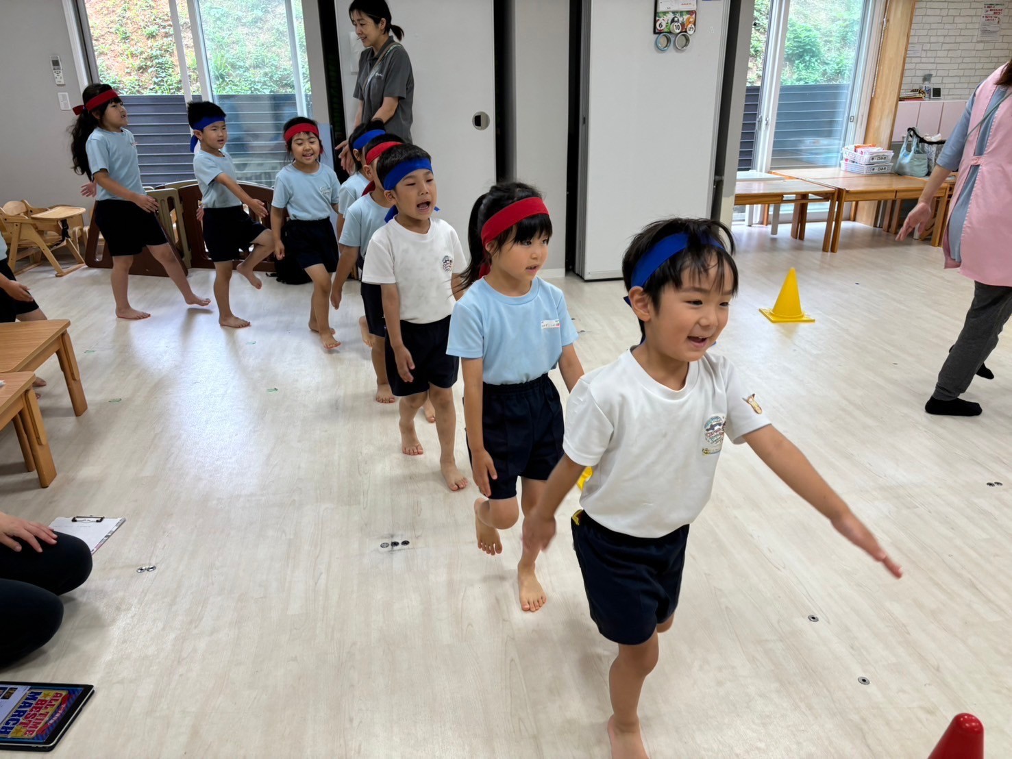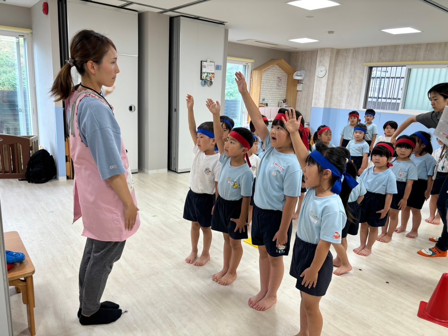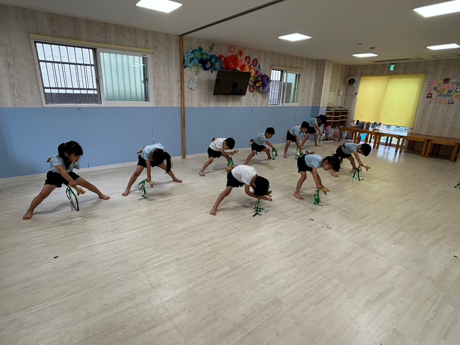 今日はくりえいと園のお友だちも来て一緒に合同練習をしました☺️💕お部屋も広くして、気合十分‼️開会式からスタートし、リレー、体操、ソーラン節、閉会式と最後までよく頑張っていましたよ🌟お互いに刺激を受けながら負けないように頑張ろうとする姿が微笑ましかったです❣️緊張もなくのびのびと練習することができました🩷練習後にはみんなで園庭で遊び、給食まで一緒に食べました😋少し距離も縮まって、帰り際にはバイバイのタッチをする姿も見られましたよ🤭次に会うリハーサルまでにお互いに練習を頑張りたいと思います😌
