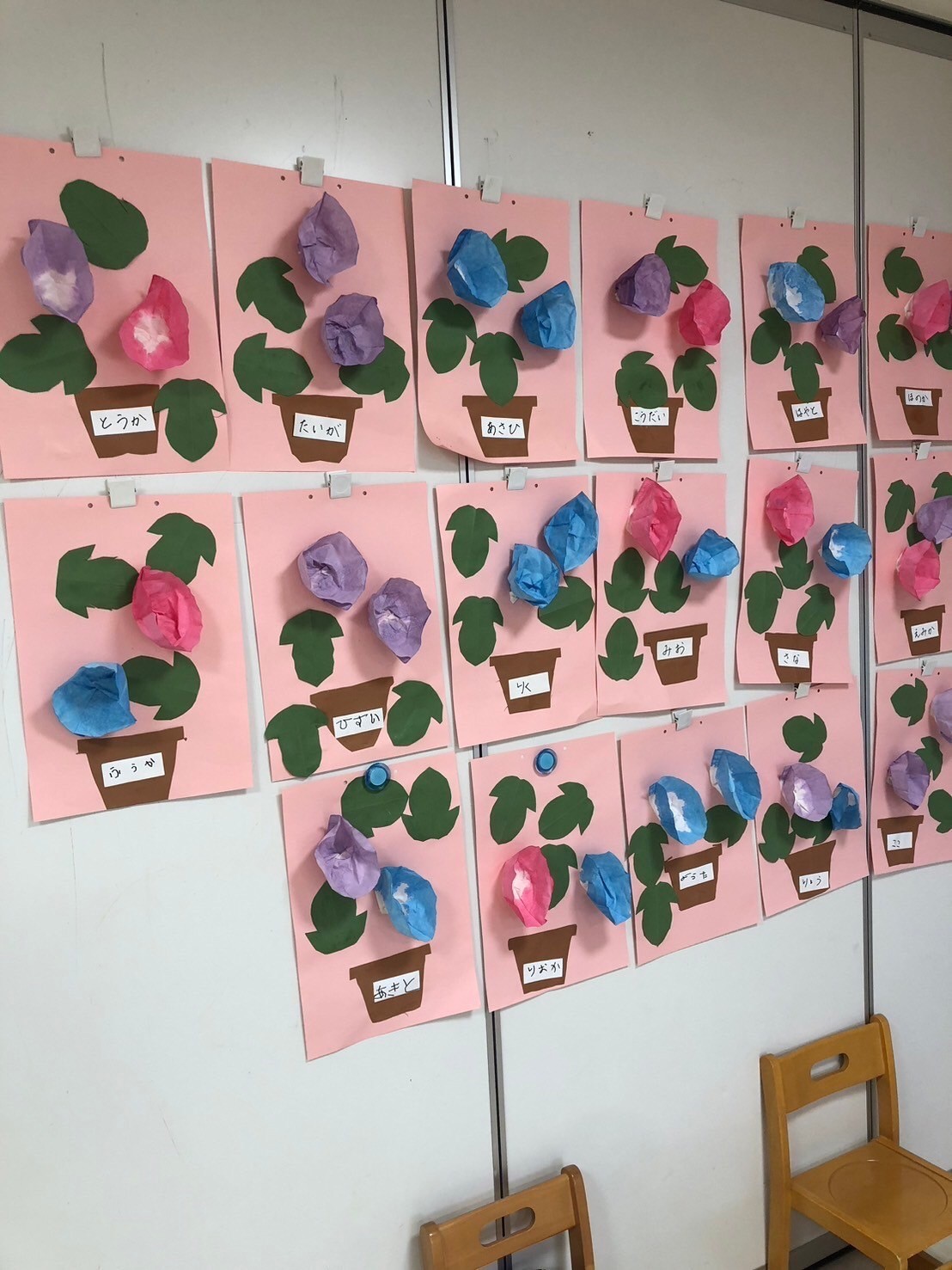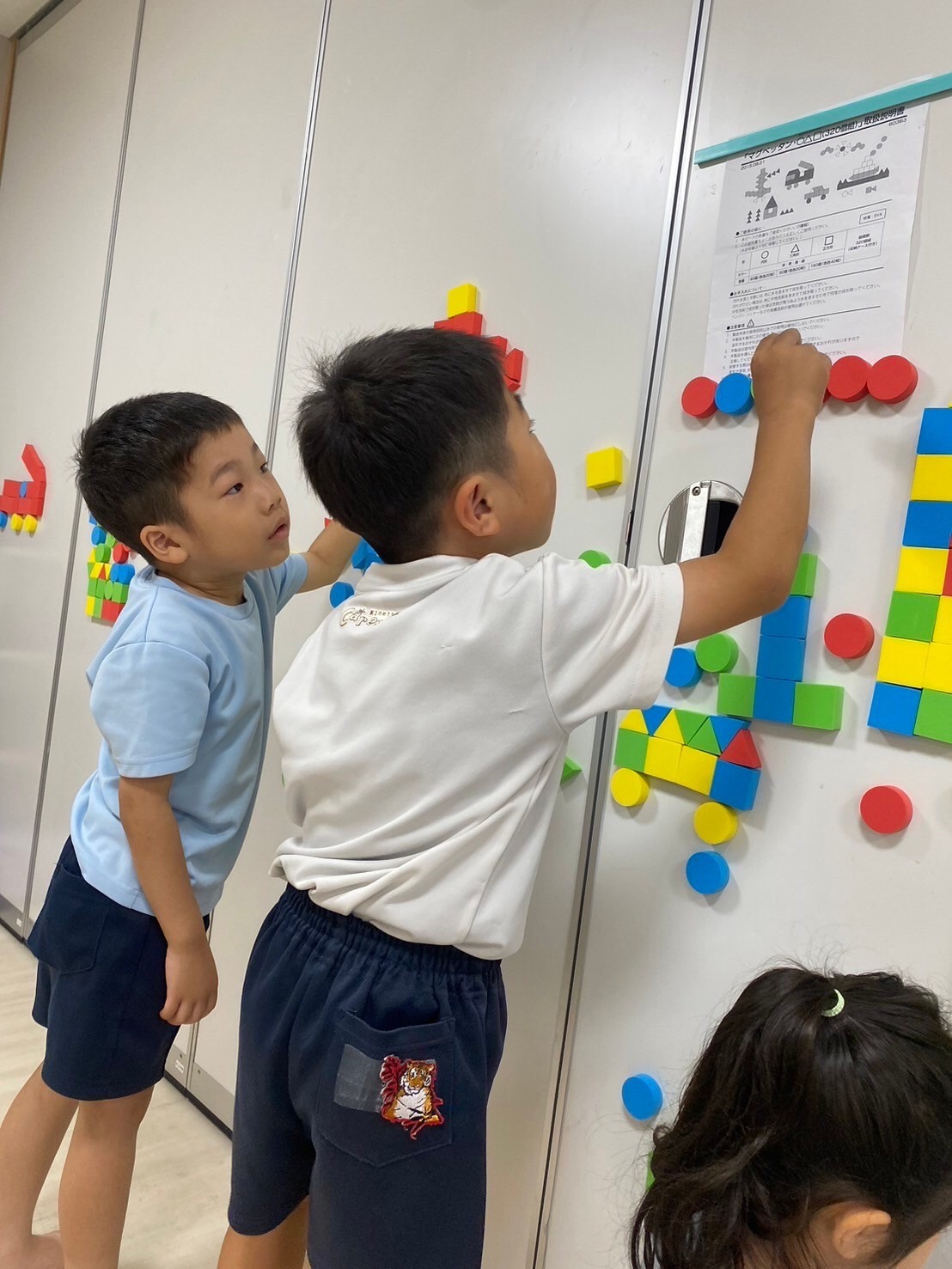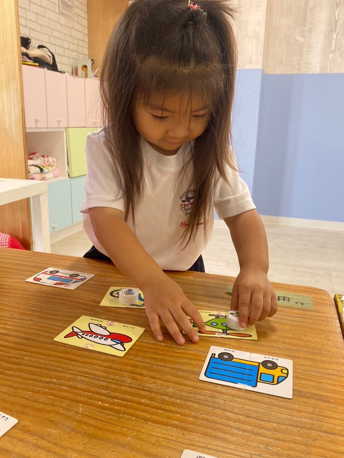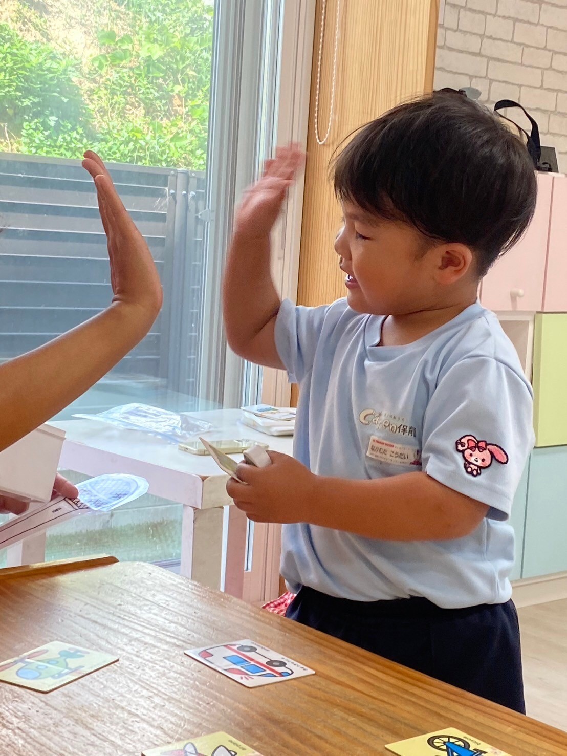 今日は英語レッスンの日でした☺️✨乗りものの単語を知ったり、カードを見ながら同じ乗り物をwalk」「jump」「stop」などの動きに合わせあて見つけたりしましたよ☺️みんな上手に見つけて楽しんでいました❣️レッスンの待ち時間には、製作の続きで朝顔の葉っぱを切ったり、貼り付けたりしました🌟お花の仕上がりに歓声が上がっていましたよ💖他にもマグペッタンやLaQや園庭でも遊び、最後には席替えもしました🥰新しい席に喜びながらの給食タイムでした😆💓