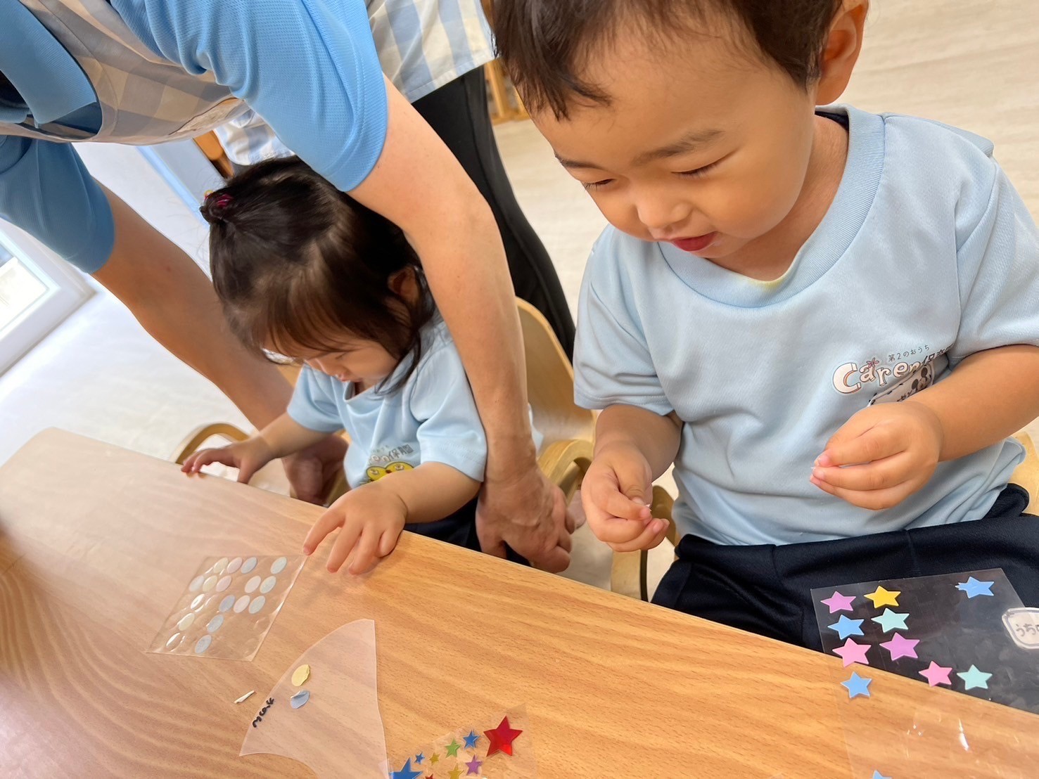 運動会プログラムのシール貼りにも意欲的で次々に手先を使って貼って楽しみ、出来上がりを喜んでいた可愛い笑顔の子どもたちでした🥰