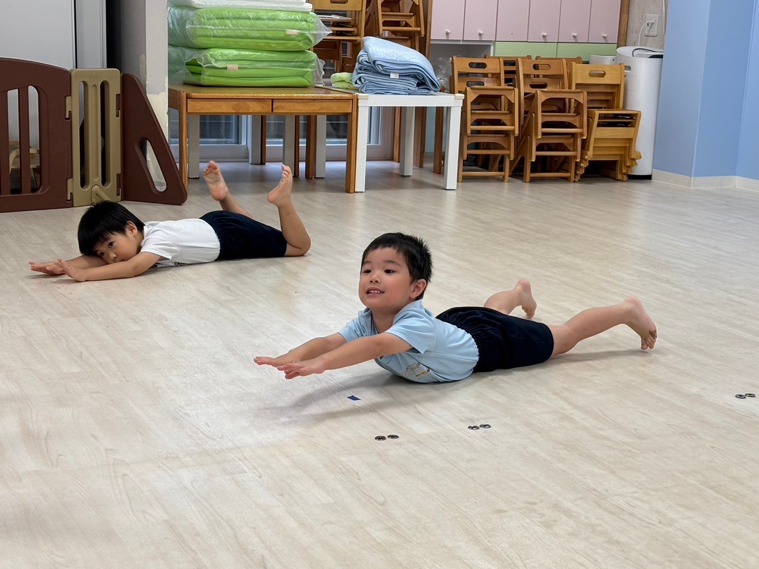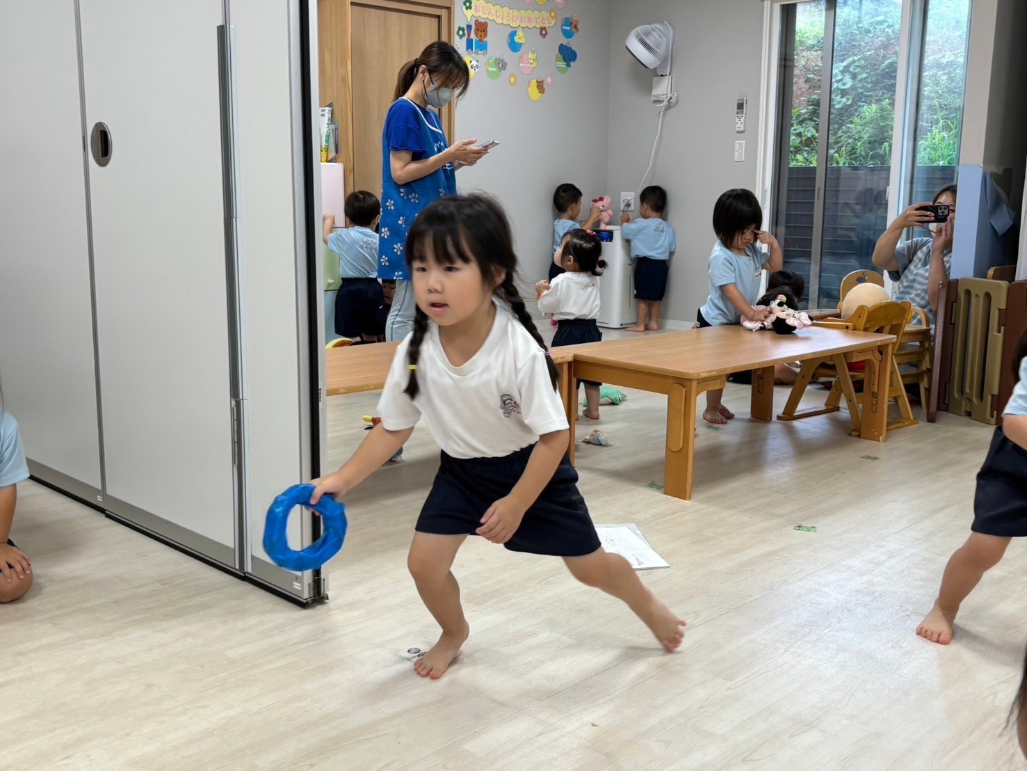 朝の会のお名前呼びでは自分の名前が呼ばれると「はい!」と手をあげて元気にお返事ができ、みんな笑顔でスタートすることができました😊今日は以上児さんの運動会の練習を近くで見ることができ、遊びそっちのけでお兄さんお姉さんの頑張っている姿に釘づけでしたよ☺️✨