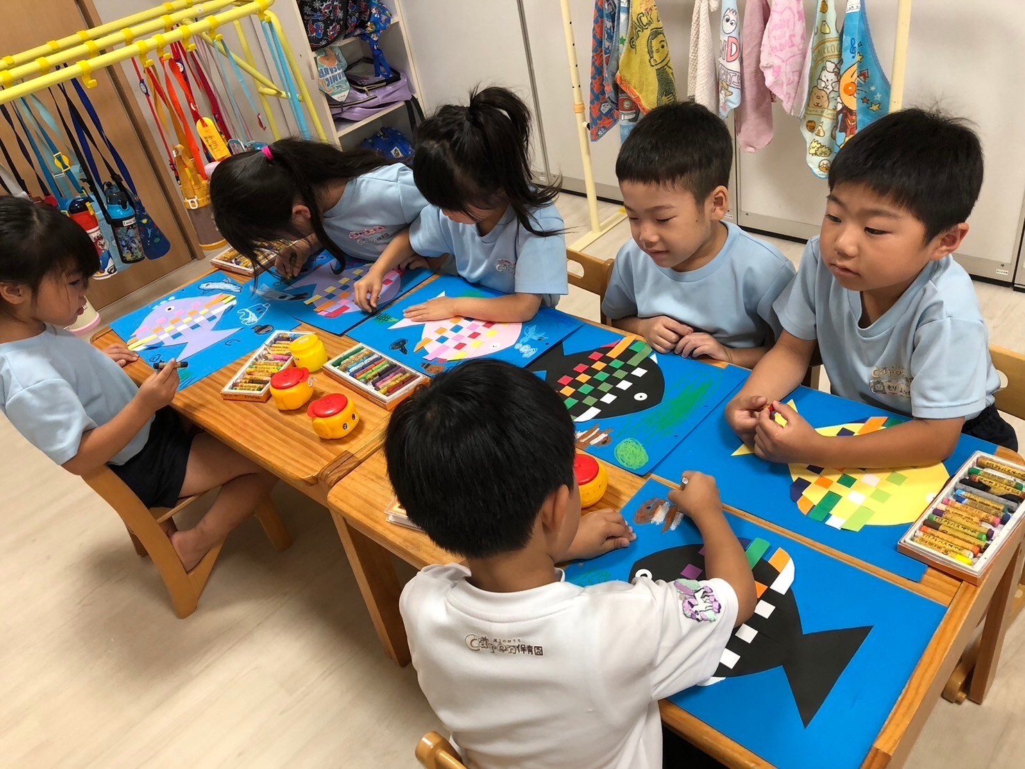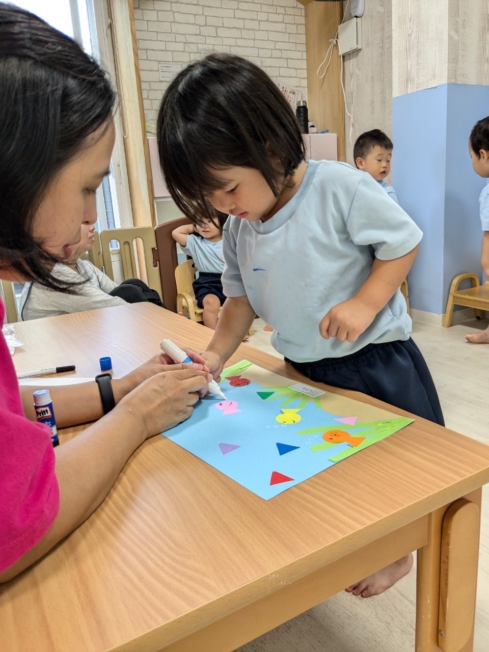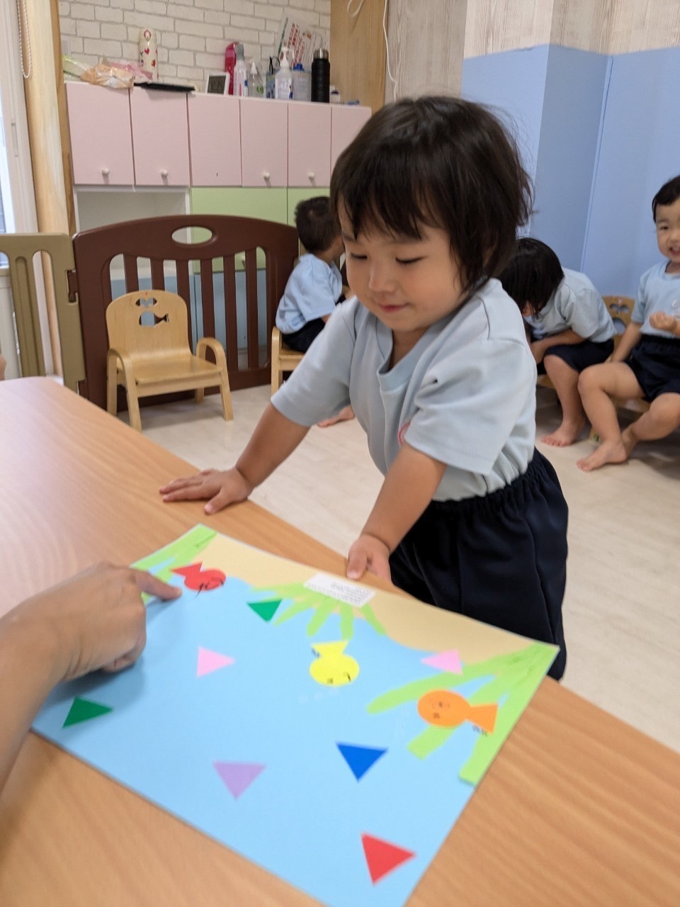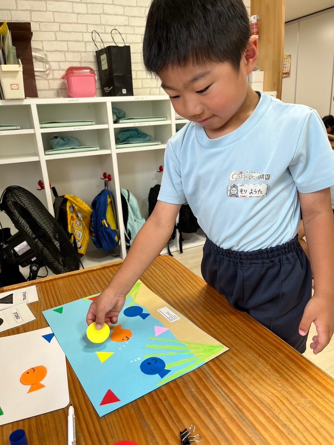 今日は英語レッスンの日、みんなで色と形を言いながら可愛い魚を作りました🐠🩷待ち時間にはLaQをしたり、製作の続きで魚の貼り付けと周りに海の生き物を描きました‼️みんな画伯でよく想像しながら描く事ができていましたよ😊うさぎさんの製作は花火です🎇思い思いに打ち上げて個性あふれる作品になりました😍最後には、園庭で霧吹きのシャワーや扇風機で冷気を送り込むなど対策しながら短時間だけ遊びました🤗暑さに負けず、元気な子どもたちでした♪💖