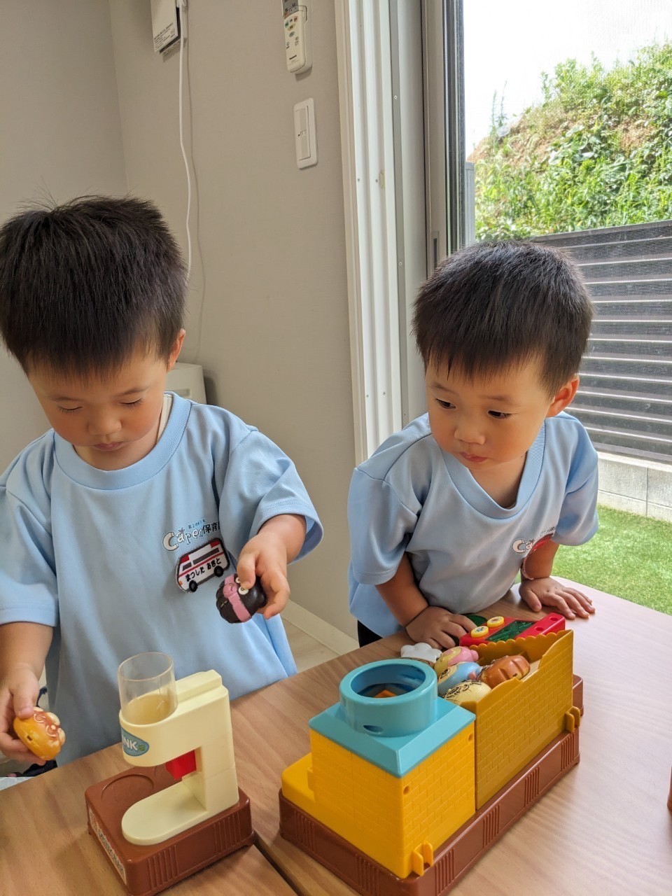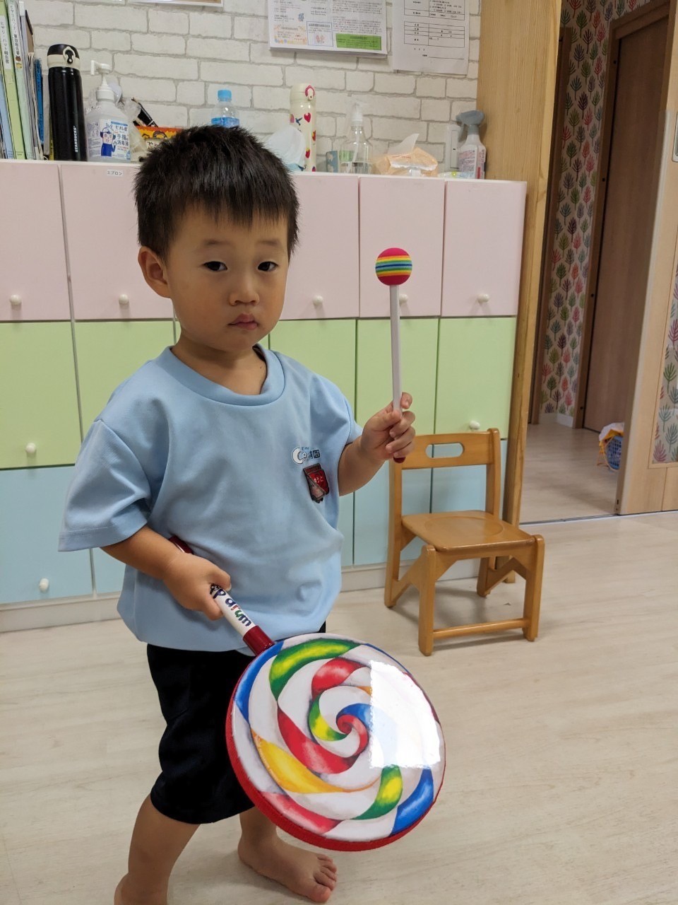 今日は絵本の読み聞かせから保育がスタート🌟週末の疲れからか朝から疲れ気味の子が多かったので、優しい絵本の先生の読み聞かせの声が心に沁みている様子でした😌✨夏祭り製作では、フルーツ飴を作りました❣️いちご・マスカット・ぶどう・パイナップルに分かれて好きな飴を作りましたよ🌟リトミックでは、アコーデオンや太鼓などいろいろな楽器に触れることができて、「まだしたかった〜」と名残惜しそうな様子でした😊曇り予報が嘘のような天気で、外で遊びたい❗️というリクエストが多く、リトミックの後は園庭で遊びました🤗汗をかきながらも、砂遊びや鬼ごっこに大盛り上がりでした🩷