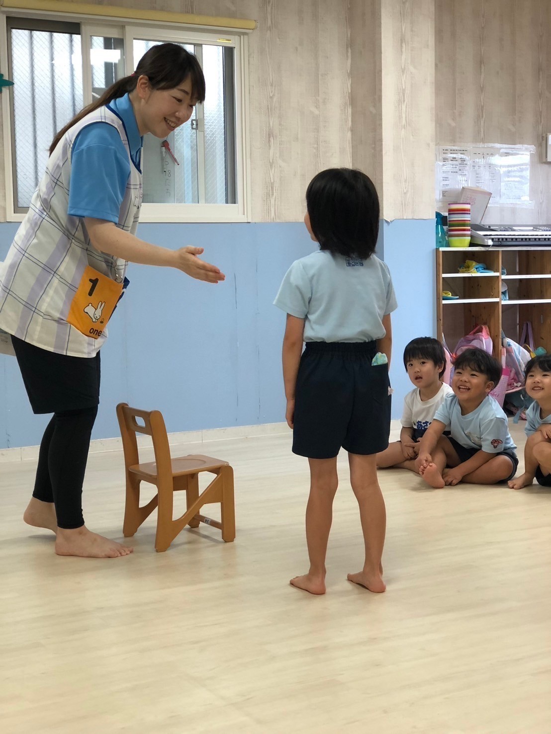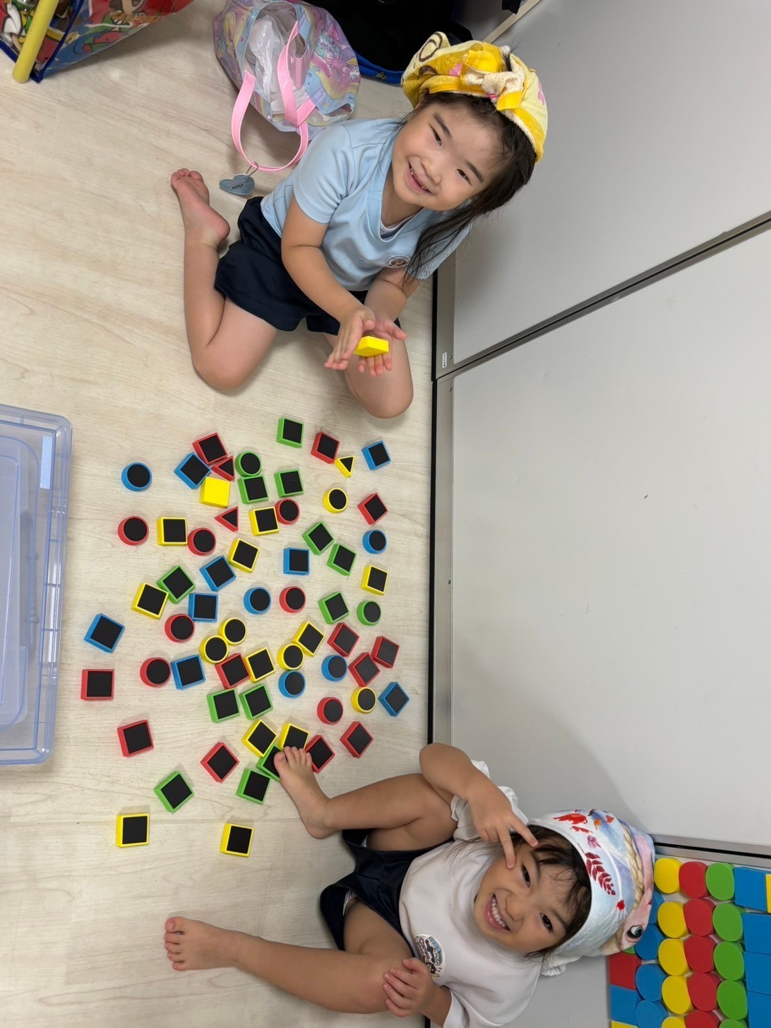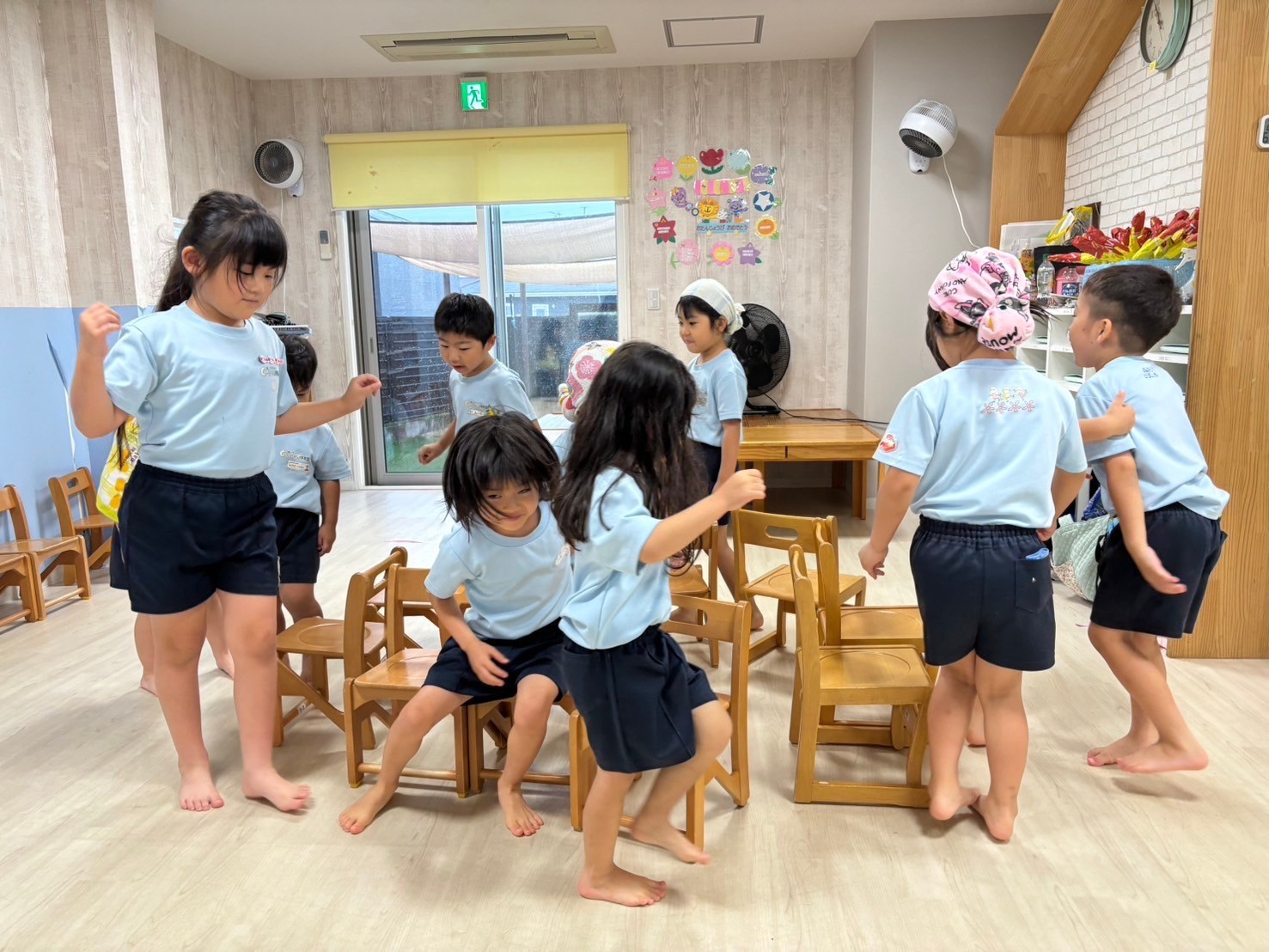 今日はまずは『もし、優しそうなママの友だちだよ〜!』という人から声をかけられたらどうする?というお話、優しそうな人でもママのお友だちって言っている人でも実は怖い人かもしれない…逃げること・声を出すこと・大人に知らせることなど確認して実際に練習してみました🙌これから世間では夏休みシーズンに入り、お出かけも増えてくるのでみんなで気をつけようね❣️と話しました🌟それから水遊び、みんな準備も上手になり、スムーズに着替えや準備体操を済ませて水の掛け合いを楽しみました😊💖楽しんでいた矢先、急に天候が崩れ始め早めの終了となったのですが、お部屋でも自分たちで考えて椅子取りゲームを始めたり、見学のお友だちが遊んでいたマグペッタンで一緒に遊んだり、きりんさんがうまくみんなをリードしてくれてとてもいい時間でした♪