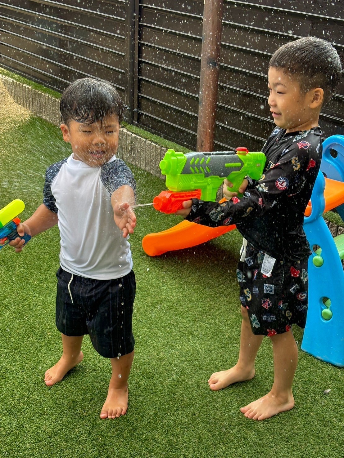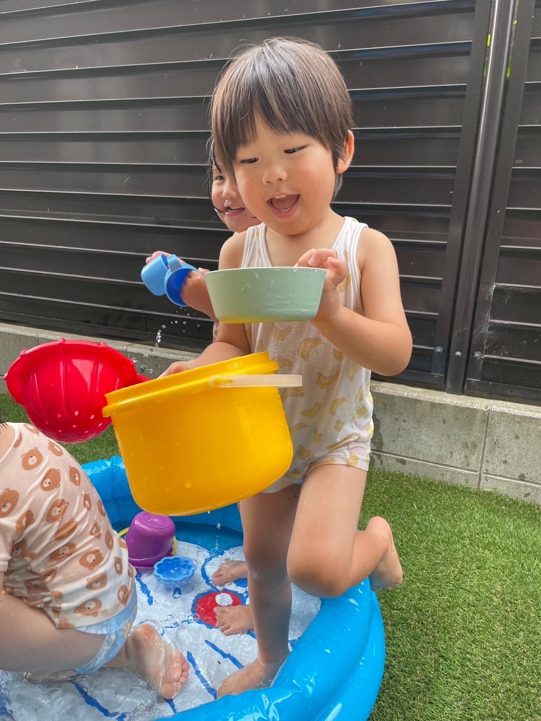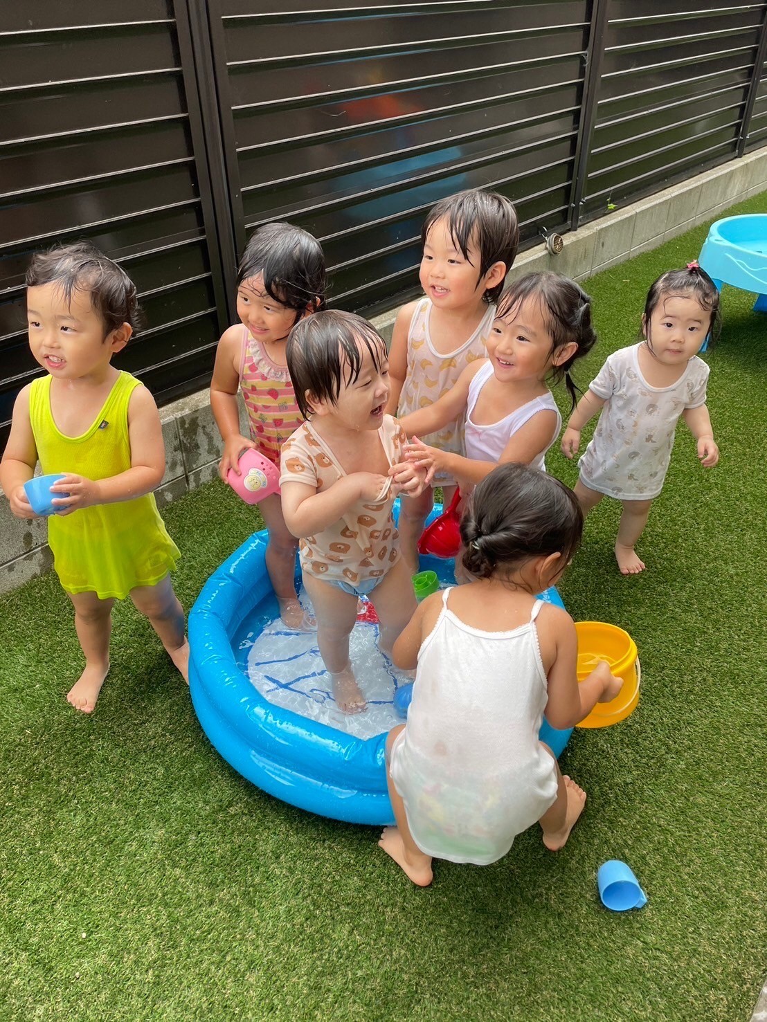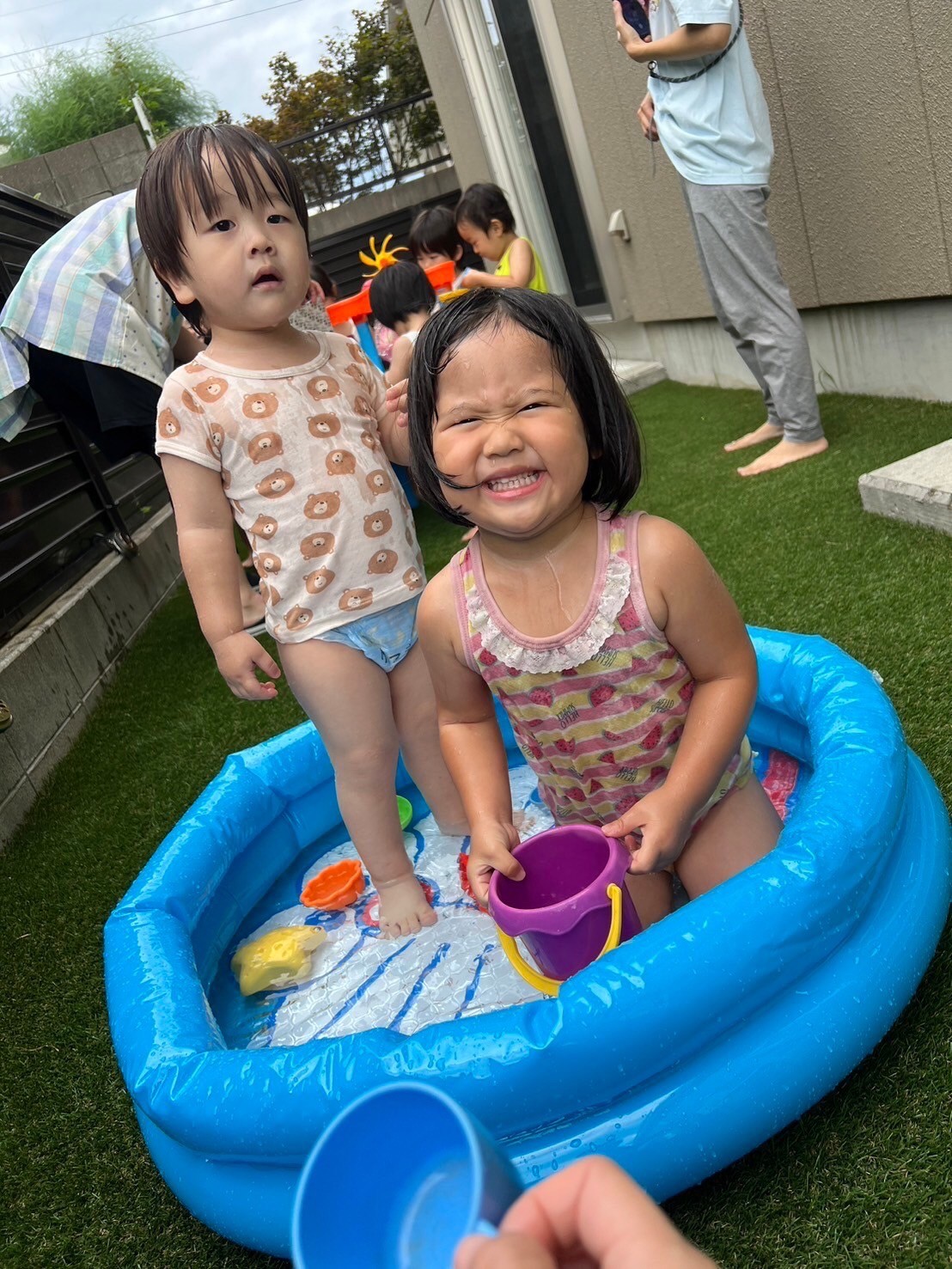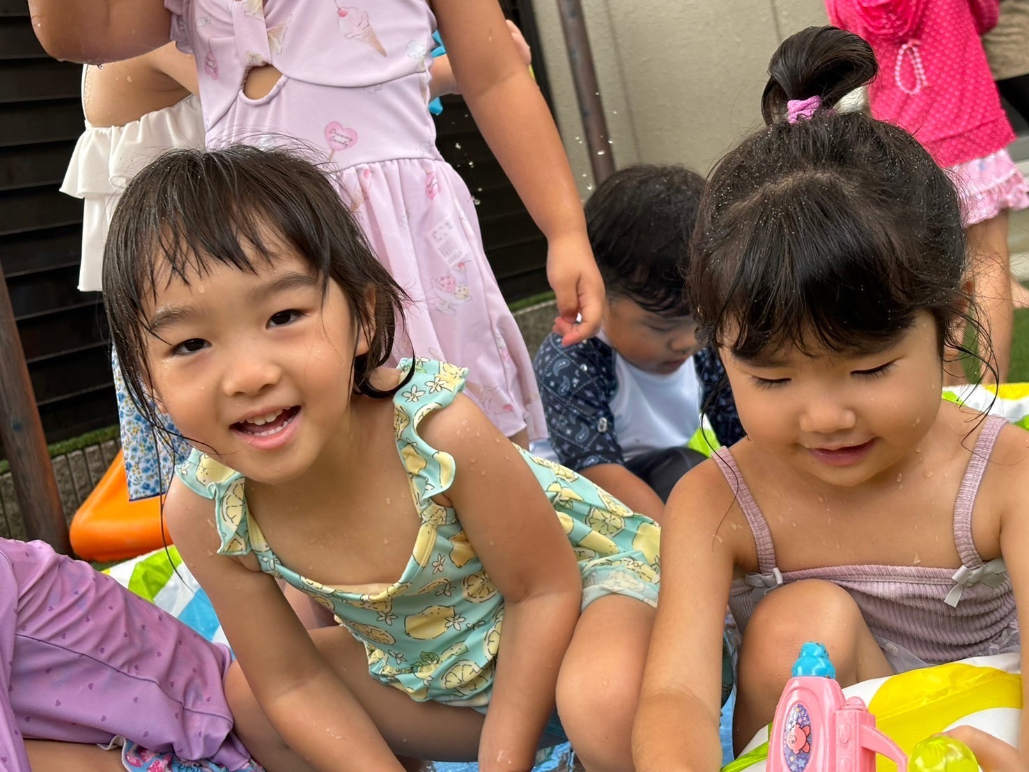 その後の水遊びでは水への恐怖心や不安感を感じることなく、繰り返し水を掛け合ったり、友だちと玩具の貸し借りをしながらコミュニケーションも楽しめていました😍