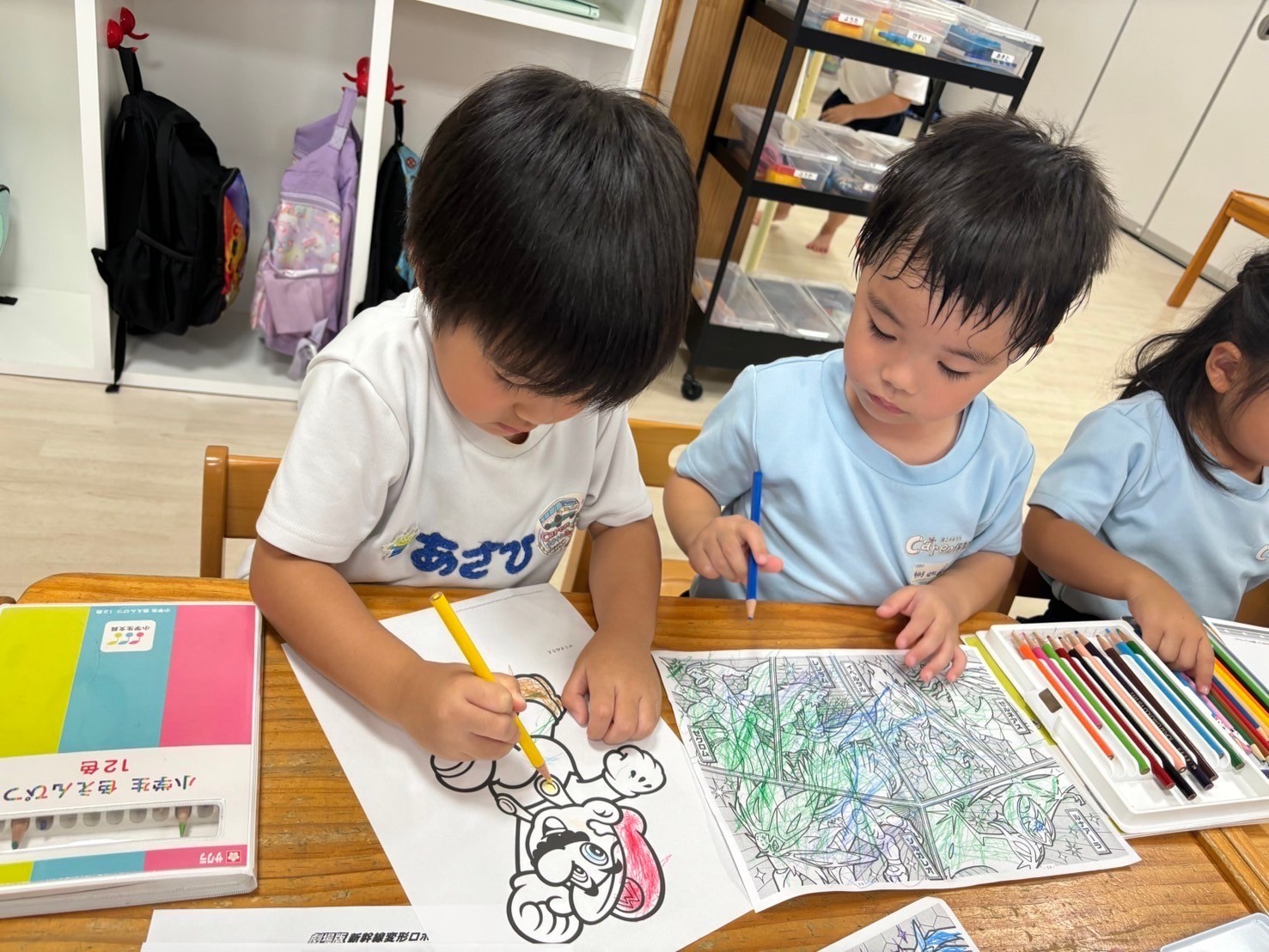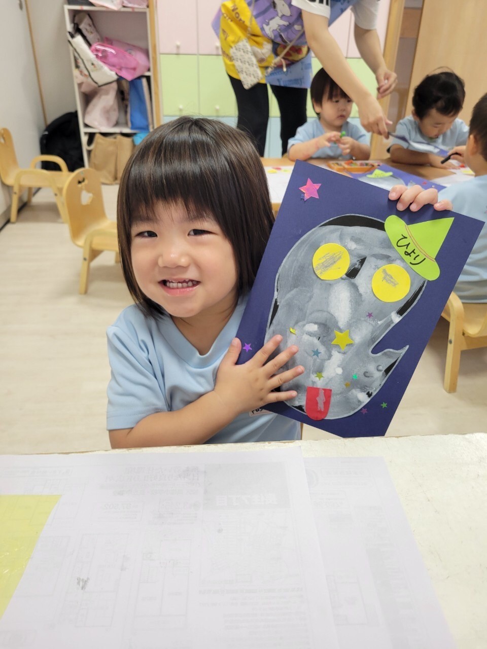 意欲的に取り組み、クレヨンの色にもこだわりを持ちながら模様を描けていた子どもたち👻❣️ 目や舌のバランスにも個性が出ていて、それぞれ可愛らしい作品が出来上がりました🌟