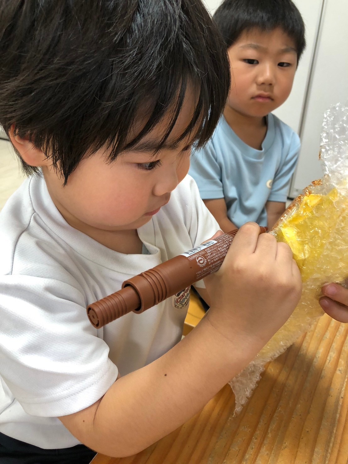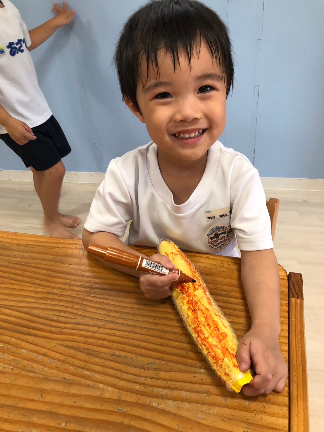 英語レッスンの日🌟海の生き物の名前にも慣れてきて、覚えているようでたくさん言える子が増えて来ました🐠🩷今日は水槽の中にいる海の生き物をみんなで数えましたよ❣️きりんさんは自分で数字を書くことにもチャレンジしました😄レッスンの待ち時間には、平均台やトランポリン、フラフープで遊び、室内でもしっかりと体を動かしました🤗そしてレッスンの後には夏祭りに向けての製作で、今日は焼きとうもろこし🌽新聞紙を丸めてとうもろこしの形を作り、画用紙で色付けをし、「つぶつぶ感が足りないね〜」とプチプチを巻き付けました☺️「まだ足りないものがあるね〜」と焦げ目をつけてみました🎶美味しそうな焼きとうもろこしができ、嬉しそうなみんなでした😍